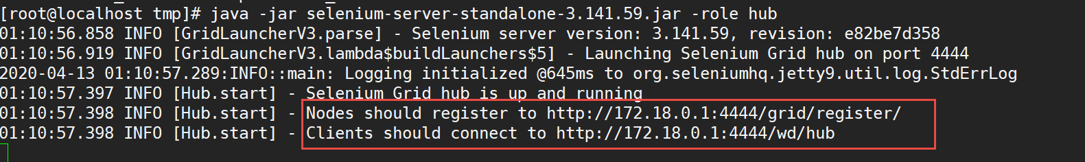 java -jar selenium-server-standalone-3.141.59.jar -role hub