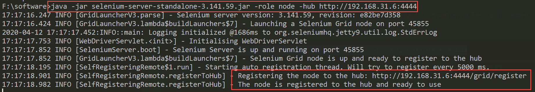 java -jar selenium-server-standalone-3.141.59.jar -role node -hub http://192.168.31.6:4444
