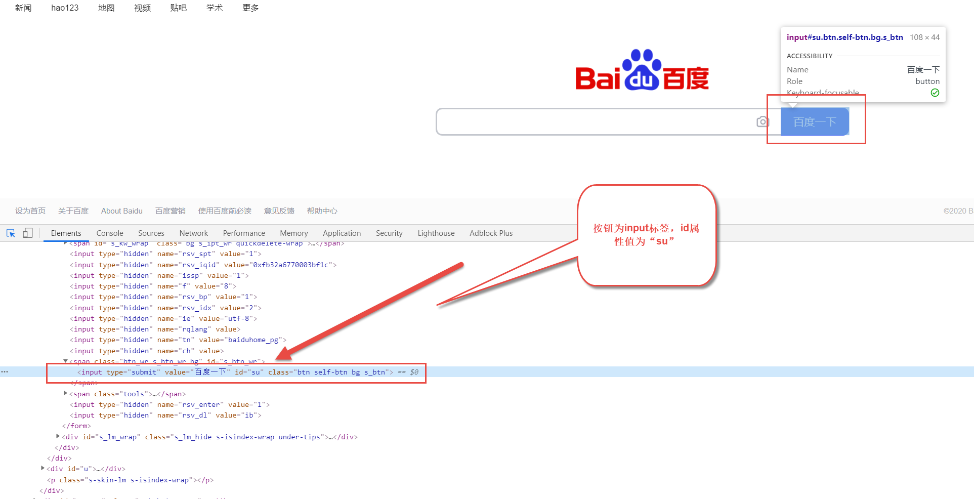 比如,定位百度页面的“百度一下”按钮。如图: