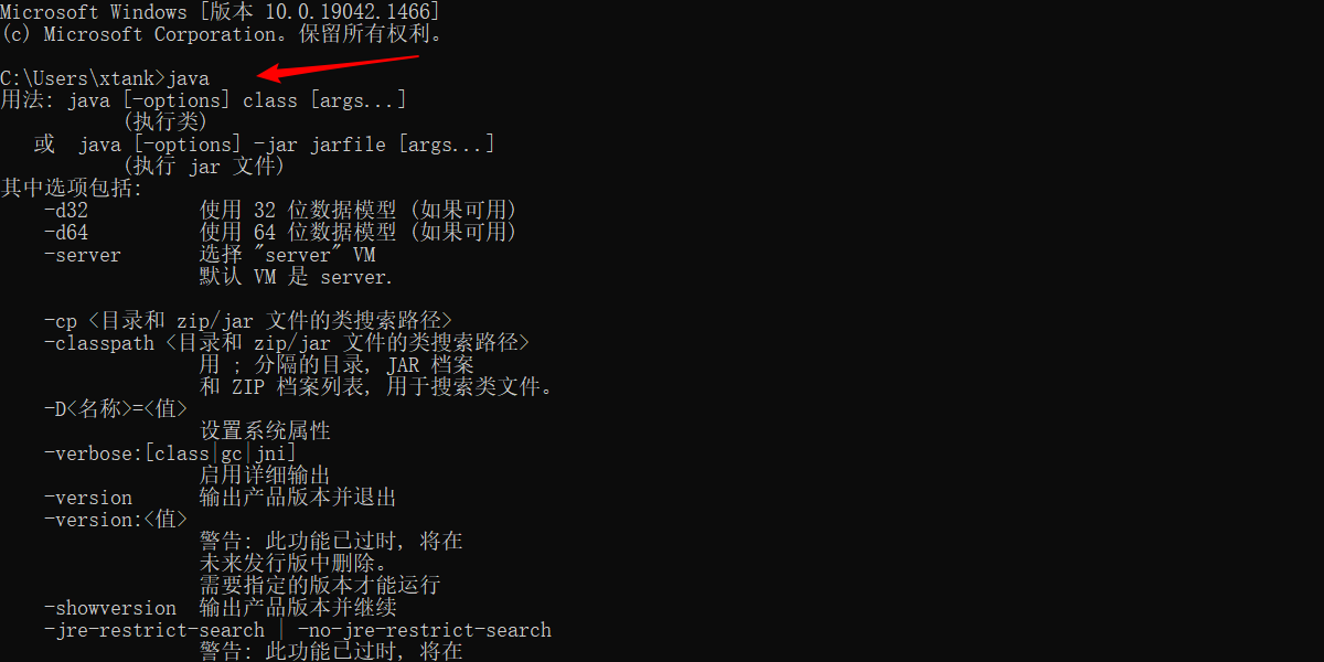 接着,检查是否安装完毕,打开命令行终端cmd,输入java命令时,并提示相关信息,说明已经安装成功