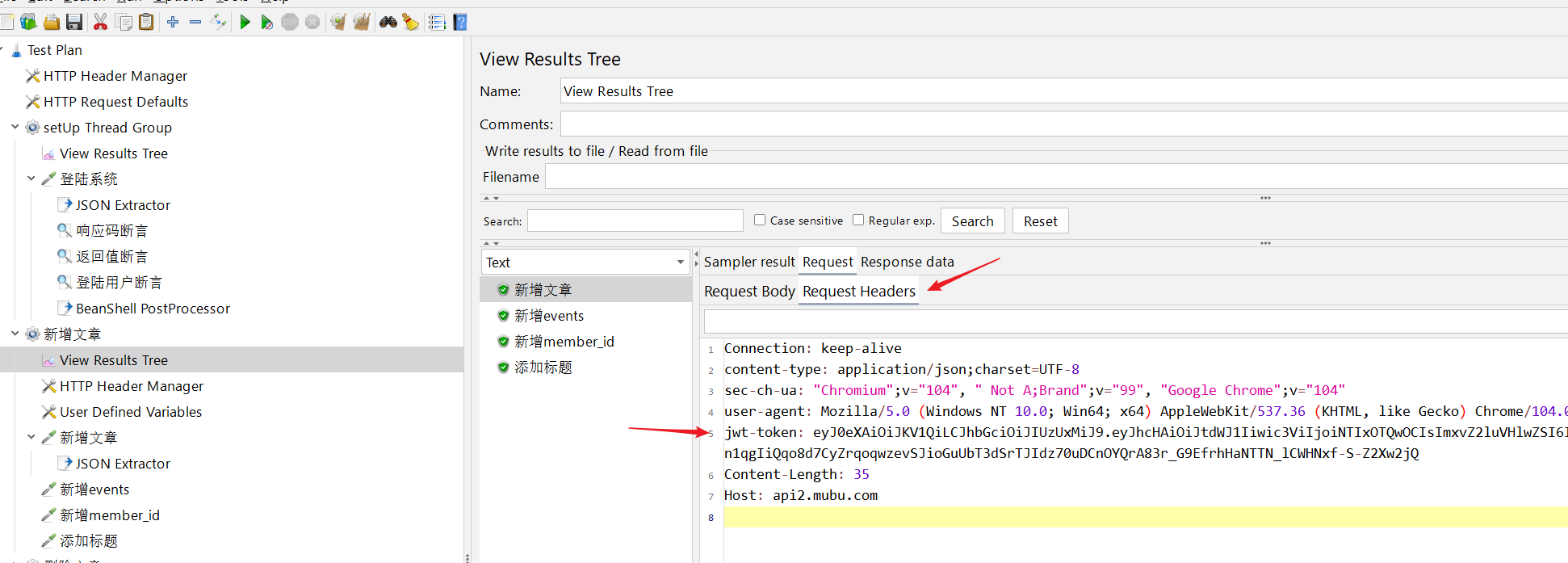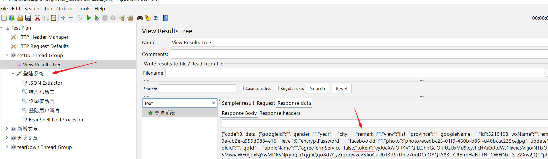 在setUp线程组下,新建取样器,也就是登陆接口,运行接口可以看到登陆接口返回的token值,由于线程组中