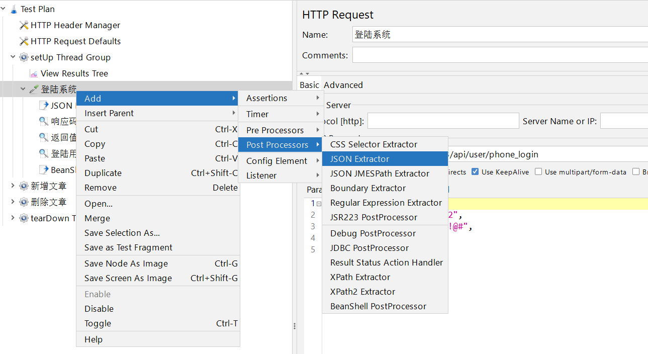 这里以新增文章接口为例,在新增文章之前需要登陆系统,所以这里把登陆操作放置在setUp线程组中。首先添加setUp线程组,如图所示: