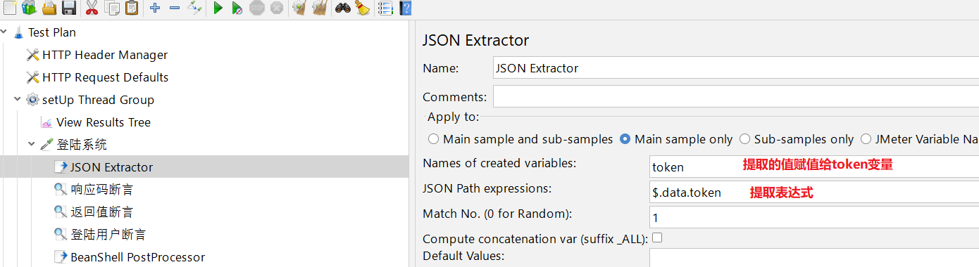 接着,需要把响应的token值提取出来,此时新添加一个json提取器,当然其他提取器也可行