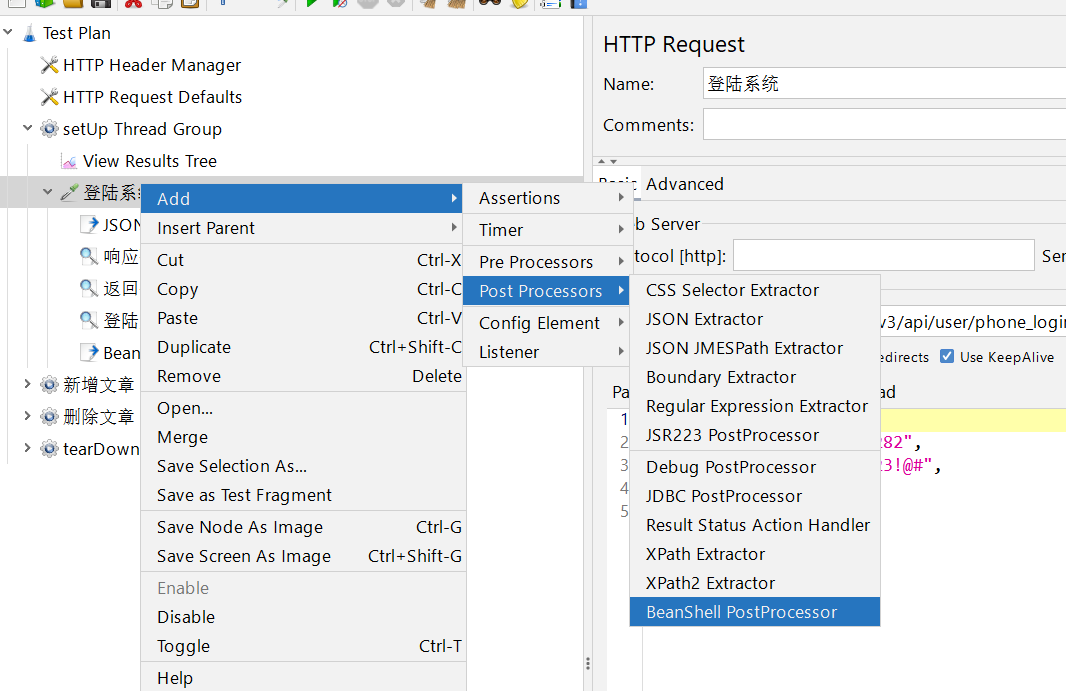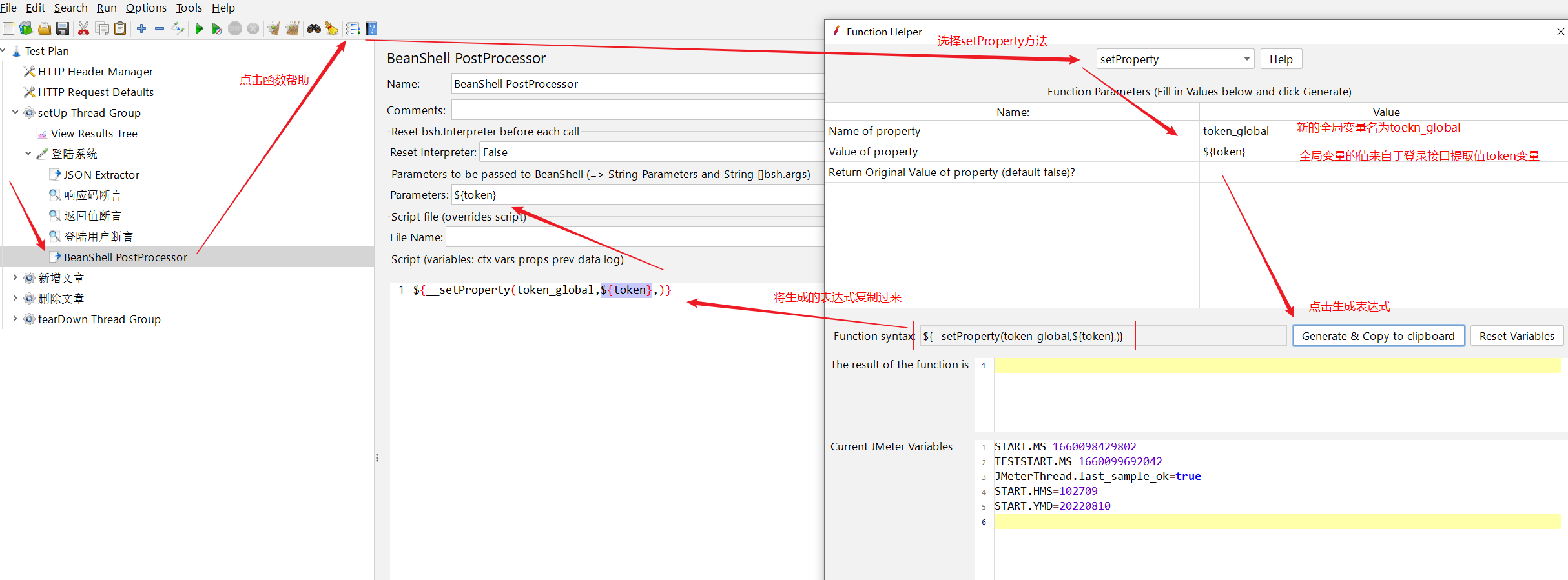 setUp线程组之下,若要跨线程组,让其他线程组的接口也能引用提取出来的token值,那么需要将token变量设置成为全局变量。此时,需要新增接口后置操作BeaShell PostProcessor,将token变量设置成为全局变量.