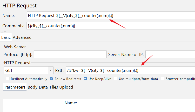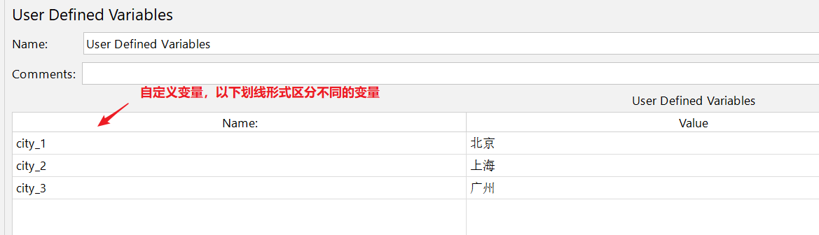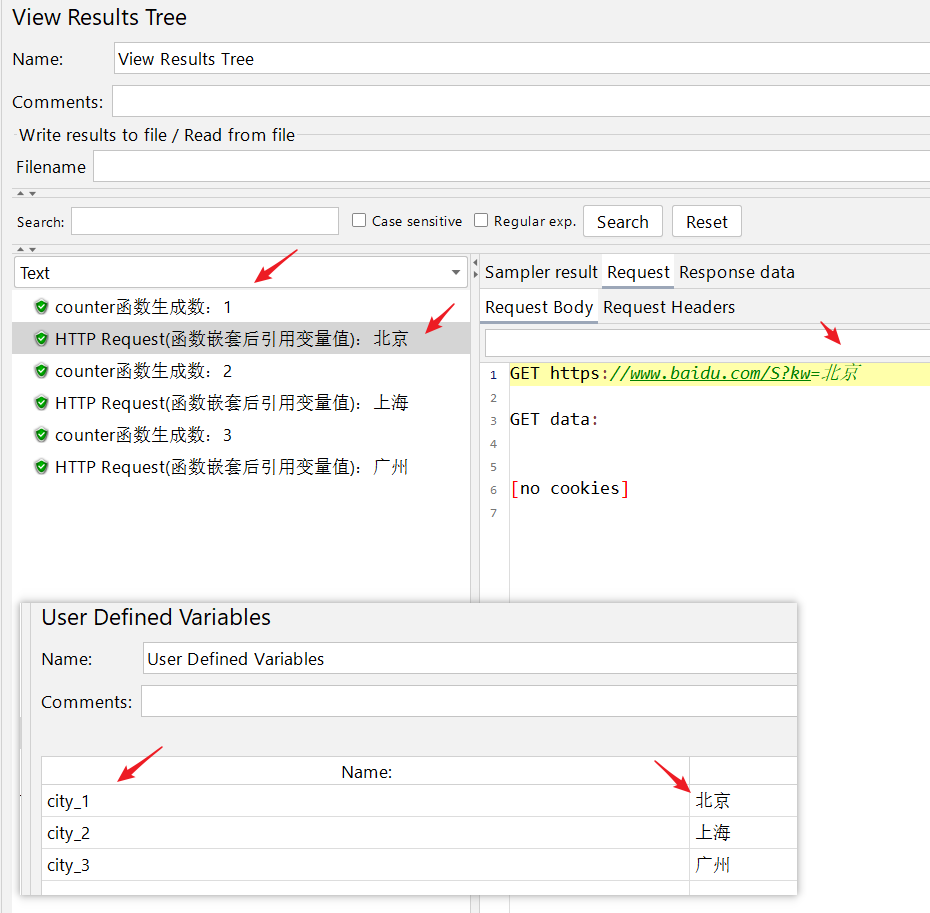 要获取用户定义变量中的city_1、city_2、city_3三个变量的值,就要用${__counter(,num)}函数,在每次执行函数是递增,生成数字1、2、3,然后与city_拼接成变量city_1、city_2、city_3三个变量。