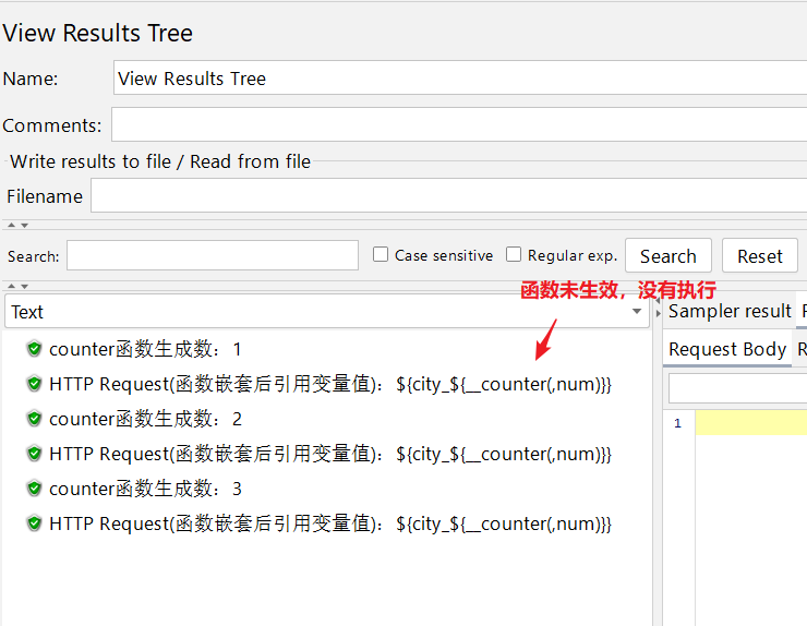 重结果看,成功用${__counter(,num)}函数,在每次执行函数是递增,生成数字1、2、3,然后与city_拼接成变量city_1、city_2、city_3三个变量。
