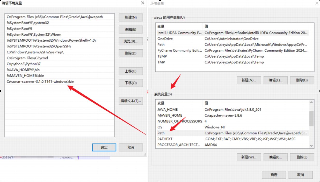 Path的末尾添加 SonarQube Scanner 的bin目录路径,例如:D:\sonar-scanner-cli-3.1.0.1141-windows\sonar-scanner-3.1.0.1141-windows\bin;