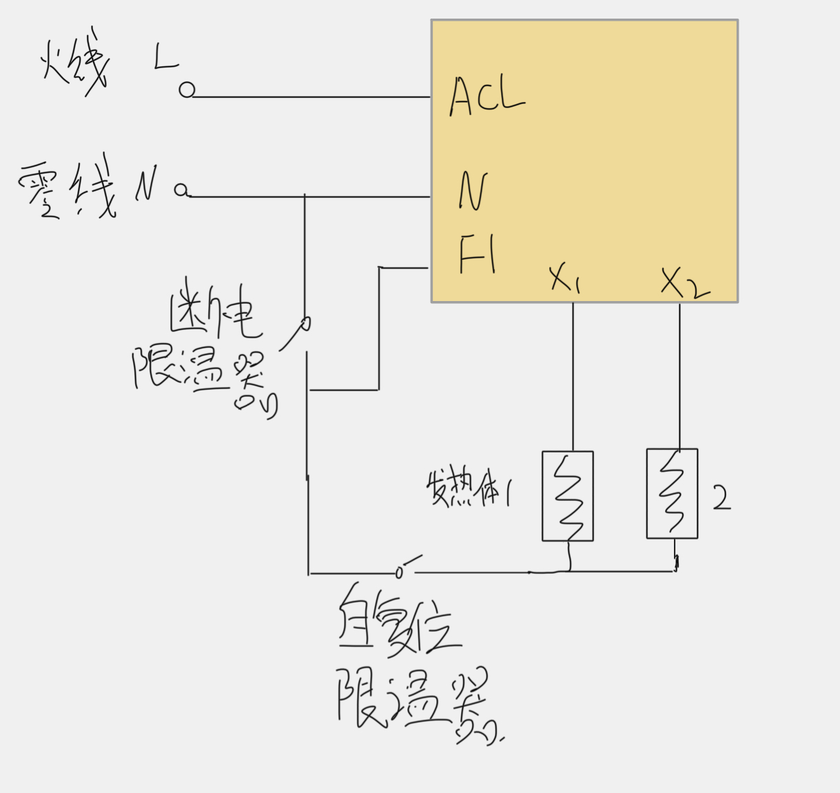 正常工作过程中左侧F1一直接零线,此时N与F1之间无电位差,上图中的三极管不会导通,右侧的F1脚也一直为低电平,外部中断不会触发,继电器X1、X2与F1间有电位差,发热体正常工作,也就是电阻上有大电流流过进行发热。当发生过温保护时,断电限温器和自复位限温器断开,此时应设置自复位限温器的断开要滞后于断电限温器,当只有断电限温器断开时,F1脚与继电器X1(ACL火线)接通,F1和X1之间无电位差,电阻上的电流很小无法发热,但此时N与F1之间有电位差,三极管导通,右侧的F1脚变为高电平,外部中断触发,进入故障检测,若持续时间在9.084ms左右,则判断为限温器故障,当然不能只判断一次,多次的过零检测,若均检测到零点,则判断为限温器故障,一般这个检测时间要小于自复位限温器的滞后时间。当过了滞后时间后,两个限温器均断开,此时F1悬空,与N之间无压差,三极管关闭,因此无法判断故障。