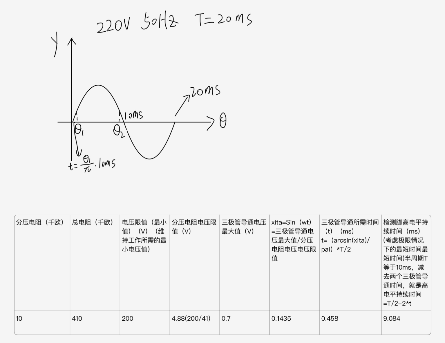假设R1电阻等于400K,R2电阻等于10K,F1处的电压为V1,因此电阻R1分压值为V1/41,三极管导通电压为0.7V,只需要V1/41>0.7V,也就是V1>28.7V时,三极管导通,此时右侧的F1脚被拉成高电平,也就是出现了上升沿,触发外部中断,判断是否出现故障。由于V1是正弦波交流电,50hz220V,注意使用峰值电压计算(220V是有效值),即220*根号2。计算过程如下,注意考虑到我们需要计算出高电平持续的最短时间,考虑极限情况,市电存在波动,考虑波动下限200v,三极管导通电压为0.7V(具体去查该三极管的手册)