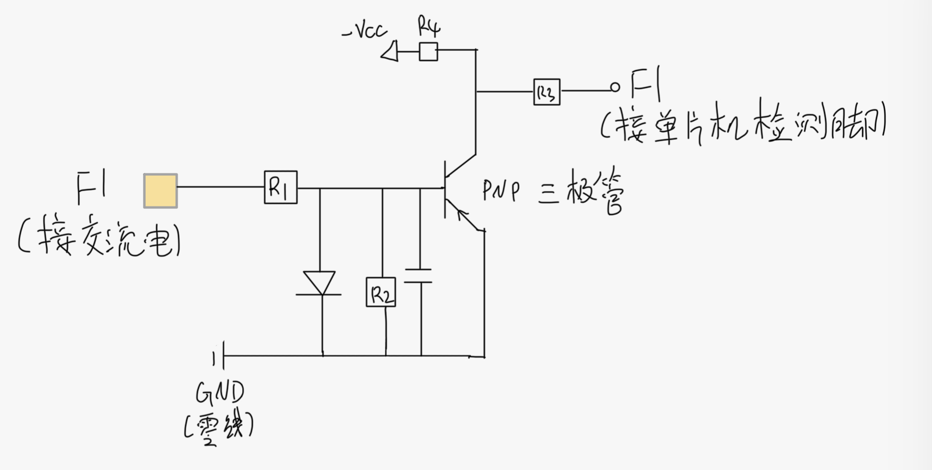 下图中右侧的F1脚需要接到单片机的外部中断上,通过上升沿检测,判断是否发生故障。左侧的F1脚检测220V交流电正弦波的零点(此零点非彼零点,相对值)。