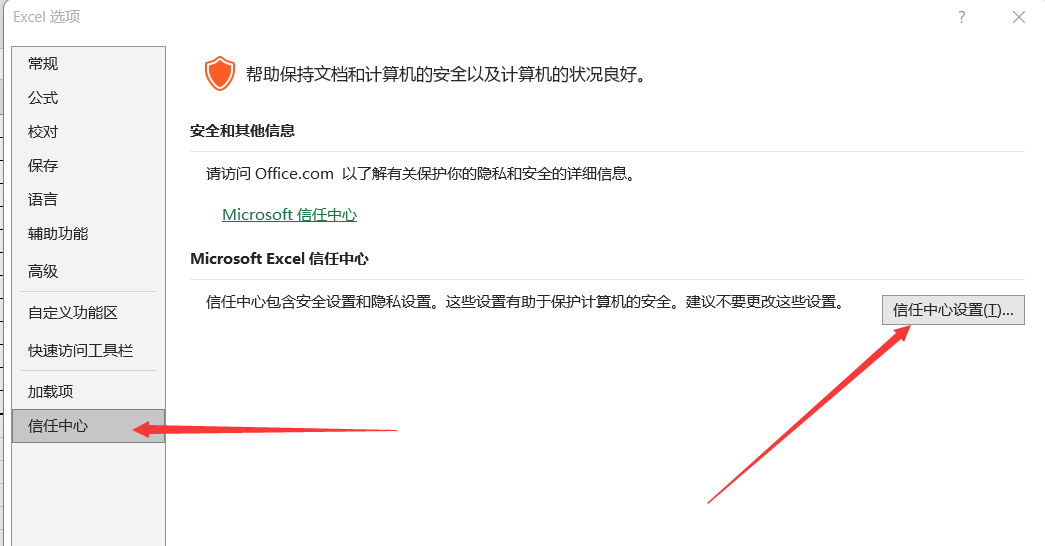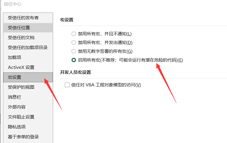 文件->更多...->选项->信任中心->信任中心设置->宏设置->启用所有宏->关闭文件重新打开