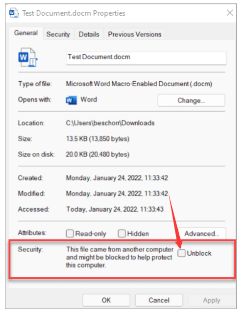 点击unblock解锁。(解锁过后再打开属性发现这个选项就消失了。)
