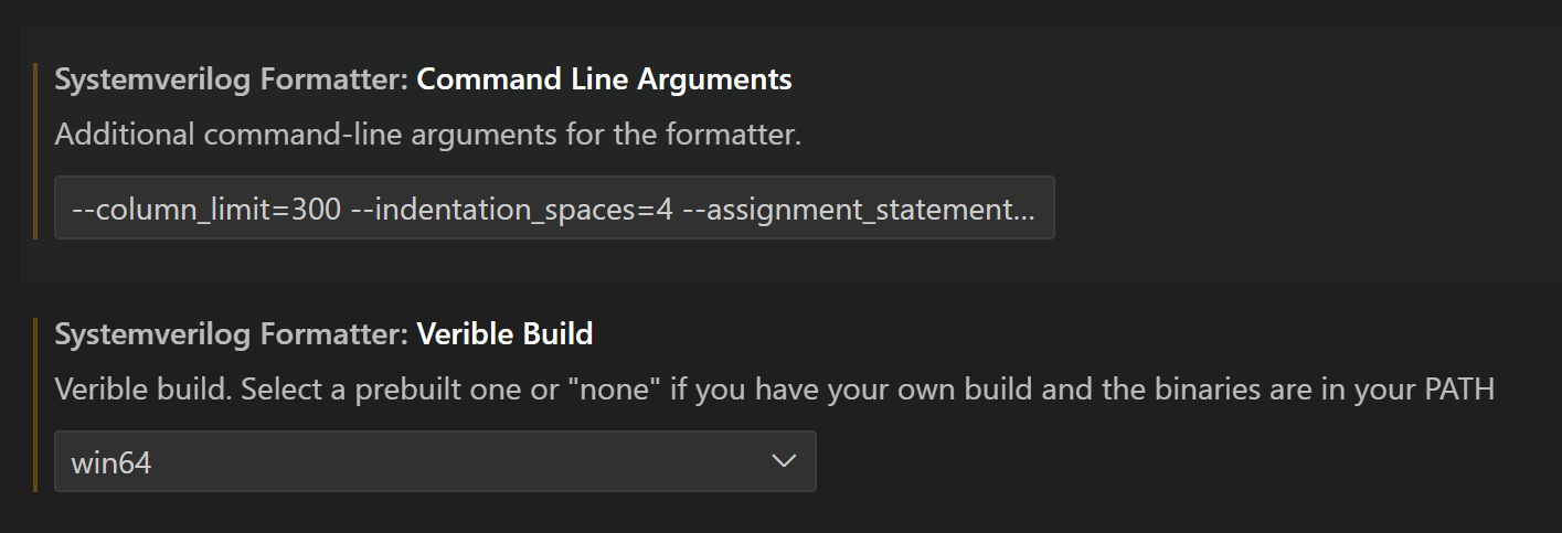 常用设置参考--column_limit=300 --indentation_spaces=4 --assignment_statement_alignment=align --named_port_alignment=align --port_declarations_alignment=align --module_net_variable_alignment=align