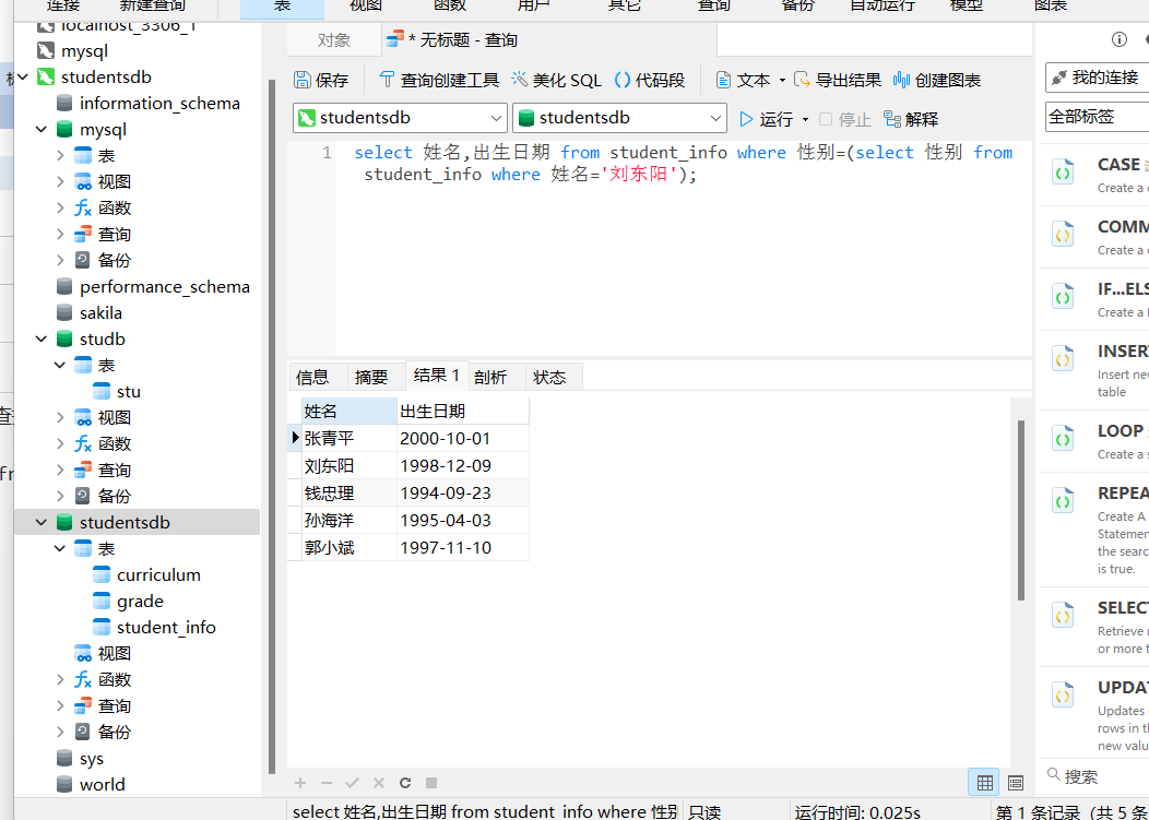 1.在student_info表中查找与“刘东阳”性别相同的所有学生的姓名、出生日期。