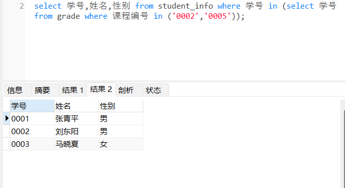 2.使用IN子查询查找所修课程编号为0002、0005的学生学号、姓名、性别。