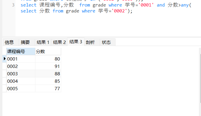 3.使用ANY子查询查找学号为0001的学生的分数比0002号的学生的最低分数高的课程编号和分数。