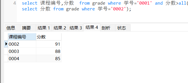 4.使用ALL子查询查找学号为0001的学生的分数比学号为0002的学生的最高成绩还要高的课程编号和分数。