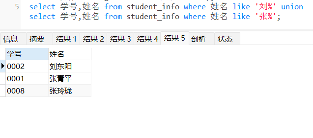 select 学号,姓名 from student_info where 姓名 like '刘%' union select 学号,姓名 from student_info where 姓名 like '张%';