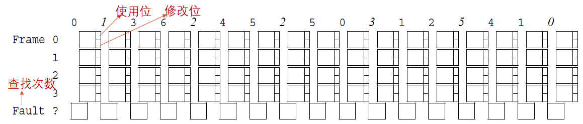 以下面这个页面置换过程为例:访问的页面依次是:0,1,3,6,2,4,5,2,5,0,3,1,2,5,4,1,0,其中红色数字表示将要修改的页面,即他们的modified bit将被设置成1,在下图中这些页面用斜体表示,使用位和修改位如下图所示。下面的"Fault ?"表示缺页时查找空闲frame的次数。