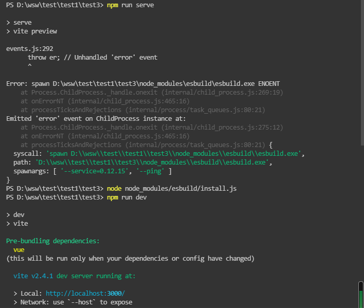 使用vite时npm run dev一直node报错events.js:292 throw er; // Unhandled 'error' event,网上找个各种方法没用