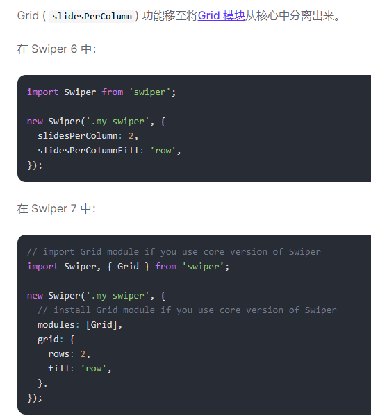 这几天用vue3.0想着试试都用最新的东西写东西用cdn引入的swiper,开始没问题,昨天突然出现grid中slidesPerColumn生成多行参数不生效的问题,找了一天在官方最新的swiper7文档中发现问题