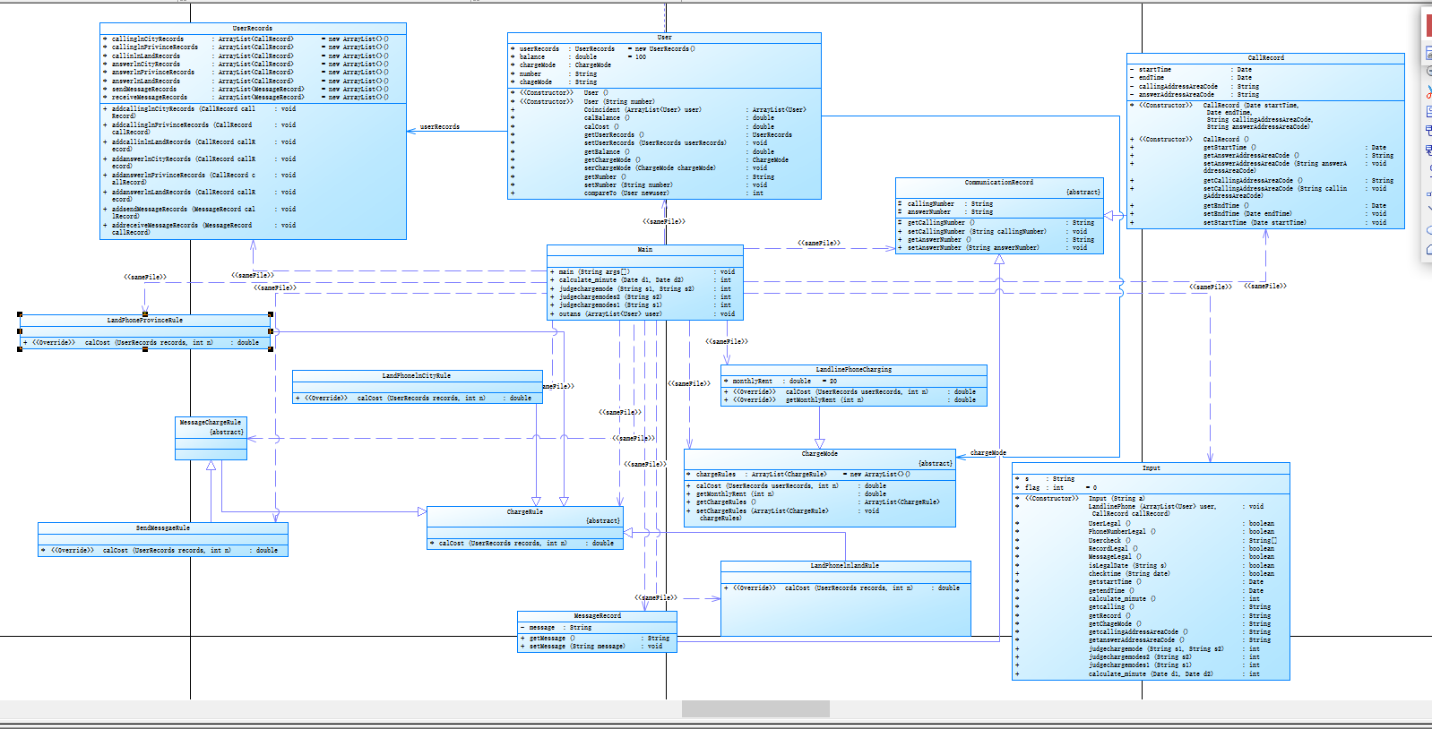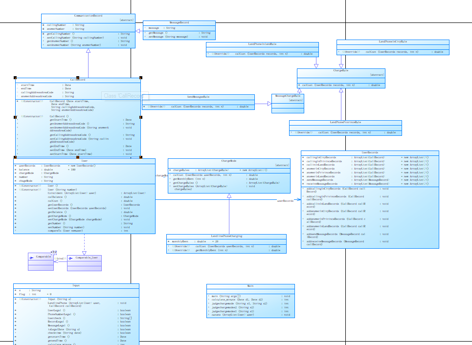 void LandlinePhone(ArrayList<User> user, CallRecord callRecord) throws ParseException { if(this.UserLegal()||this.PhoneNumberLegal()){ User tep= new User(); tep.setNumber(this.Usercheck()[0]); user.add(tep); ChargeMode chargeMode= new LandlinePhoneCharging(); chargeMode.chargeRules.add(new LandPhonelnCityRule()); chargeMode.chargeRules.add(new LandPhoneProvinceRule()); chargeMode.chargeRules.add(new LandPhonelnlandRule()); chargeMode.chargeRules.add(new SendMessgaeRule()); tep.serChargeMode(chargeMode); tep.chageMode = this.getChageMode(); } else if(this.RecordLegal()){ callRecord= new CallRecord(this.getstartTime(),this.getendTime(),this.getcallingAddressAreaCode(),this.getanswerAddressAreaCode()); User tep =null; User tep1 = null; user= User.Coincident(user); for(User a:user){ if(a.getNumber().equals(this.getcalling())) tep= a; if(a.getNumber().equals(this.getRecord())) tep1= a; } if(tep!=null) { //System.out.println(tep.number); if (judgechargemodes2(callRecord.getAnswerAddressAreaCode()) == 1) tep.userRecords.addcallinglnCityRecords(callRecord); if (judgechargemodes2(callRecord.getAnswerAddressAreaCode()) == 2) tep.userRecords.addcallinglnPrivinceRecords(callRecord); if (judgechargemodes2(callRecord.getAnswerAddressAreaCode()) == 3) tep.userRecords.addcallinlnLandRecords(callRecord); } if(tep1 != null){ if (judgechargemodes2(callRecord.getAnswerAddressAreaCode()) == 1) tep1.userRecords.addanswerlnCityRecords(callRecord); if (judgechargemodes2(callRecord.getAnswerAddressAreaCode()) == 2) tep1.userRecords.addanswerlnPrivinceRecords(callRecord); if (judgechargemodes2(callRecord.getAnswerAddressAreaCode()) == 3) tep1.userRecords.addanswerlnLandRecords(callRecord); } } else if(MessageLegal()){ String phone = s.substring(2,13); String messgae = s.substring(26); MessageRecord messageRecord = new MessageRecord(); messageRecord.setMessage(messgae); User tep =null; user= User.Coincident(user); for(User a:user){ if(a.getNumber().equals(phone)) tep= a; } if(tep!=null) { tep.userRecords.addsendMessageRecords(messageRecord); } } }