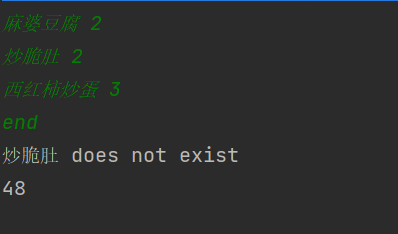 每条点菜记录输出:序号+英文空格+菜名+英文空格+价格。其中的价格等于对应记录的菜品\*份数,序号是之前输入的订单记录的序号。如果订单中包含不能识别的菜名,则输出“\*\* does not exist”,\*\*是不能识别的菜名