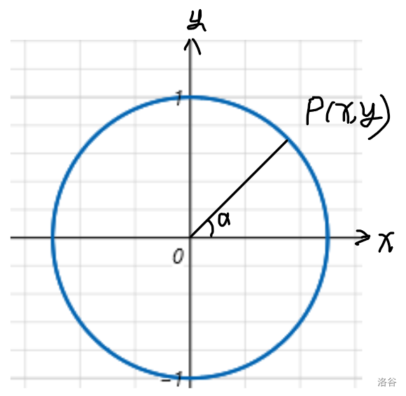 设 \(\alpha\) 是一个任意角,\(\alpha \in \mathbf R\),它的终边 \(OP\) 与单位圆相交于点 \(P(x,y)\).