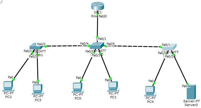 步骤:打通这三个路由 --> 配置VTP --> 给每个交换机配vlan --> 给三层设备配置子路由表