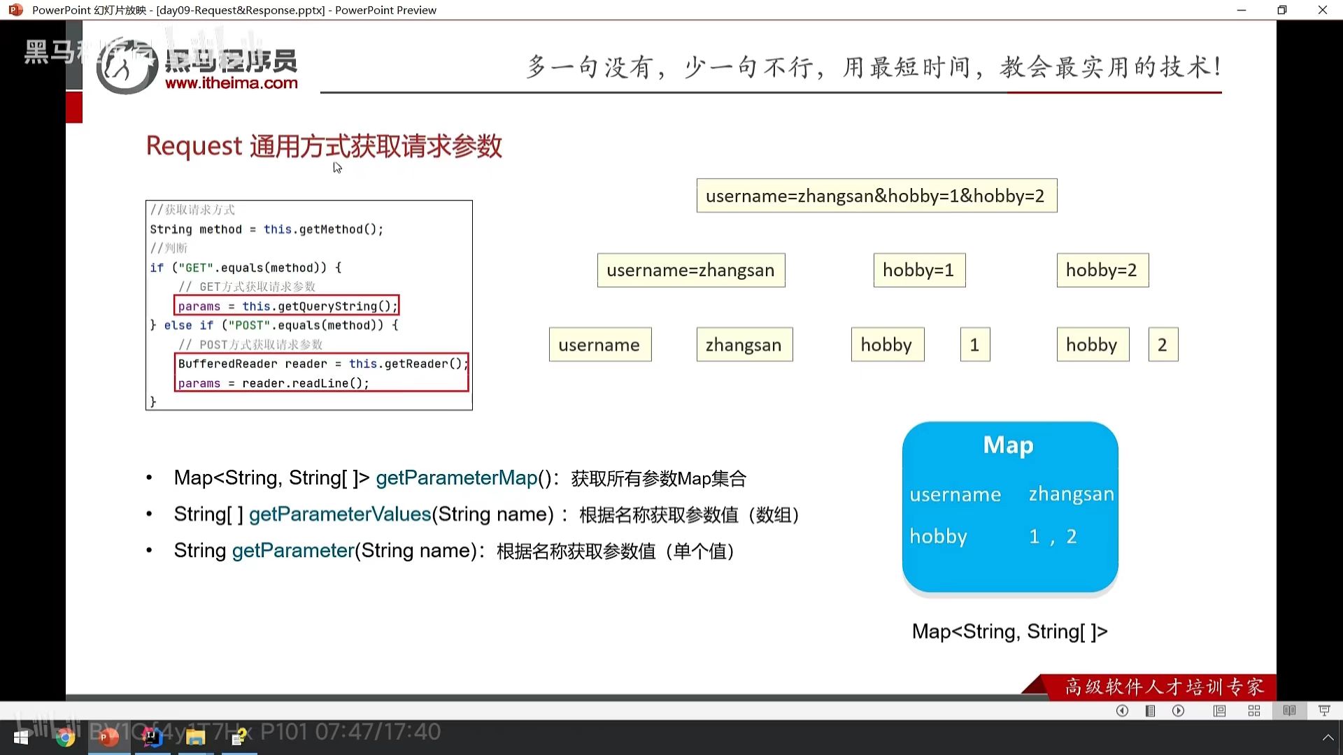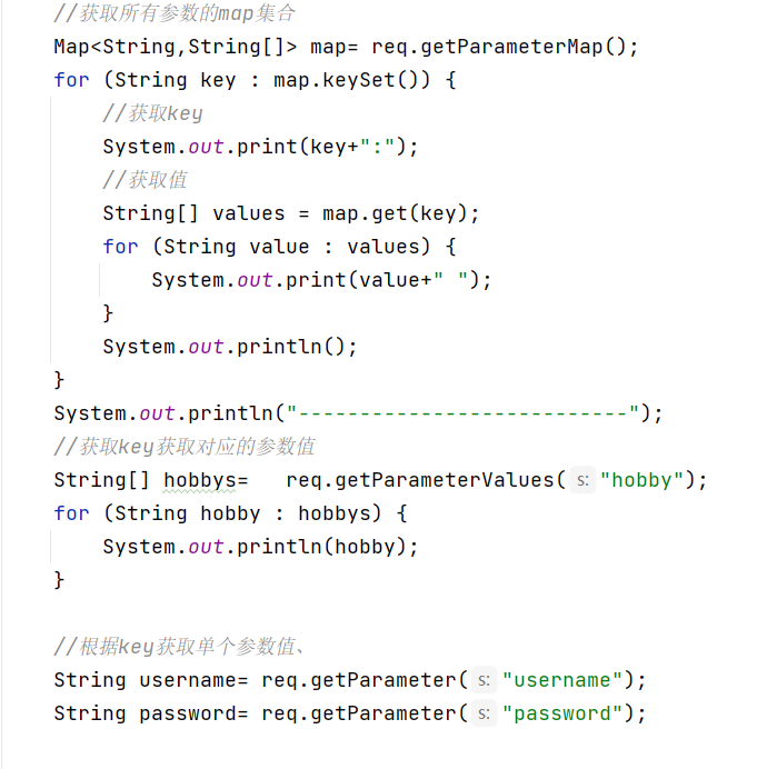 下面说一下获取请求参数的方法,有三个 方法,获取所有参数map集合:getParameterMap(),根据名称获取参数值(数组):getParameterValues(String name),