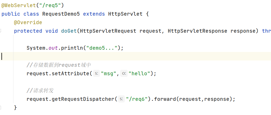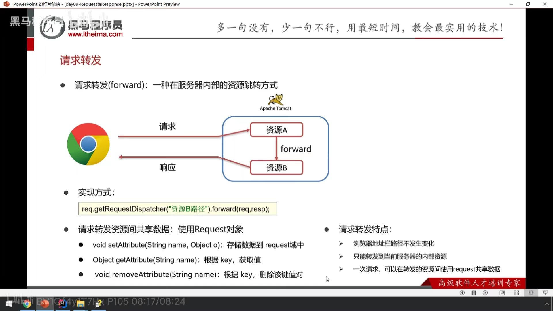 接下来就是转发问题,转发就是当浏览器发给服务器的请求时,请求给到资源A时,资源A调用forward()方法把请求转发给服务器里的资源B。其中有个request资源共享域,可以在A资源中把一些数据(以键值对形式)存入request资源域中,B资源可以调用这个共享资源域中的数据。