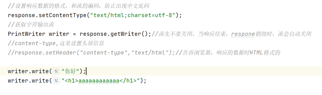 然后获得字符输出流:PrintWriter writer = response.getWriter();之后就可以用write调用write()方法,输出字符: