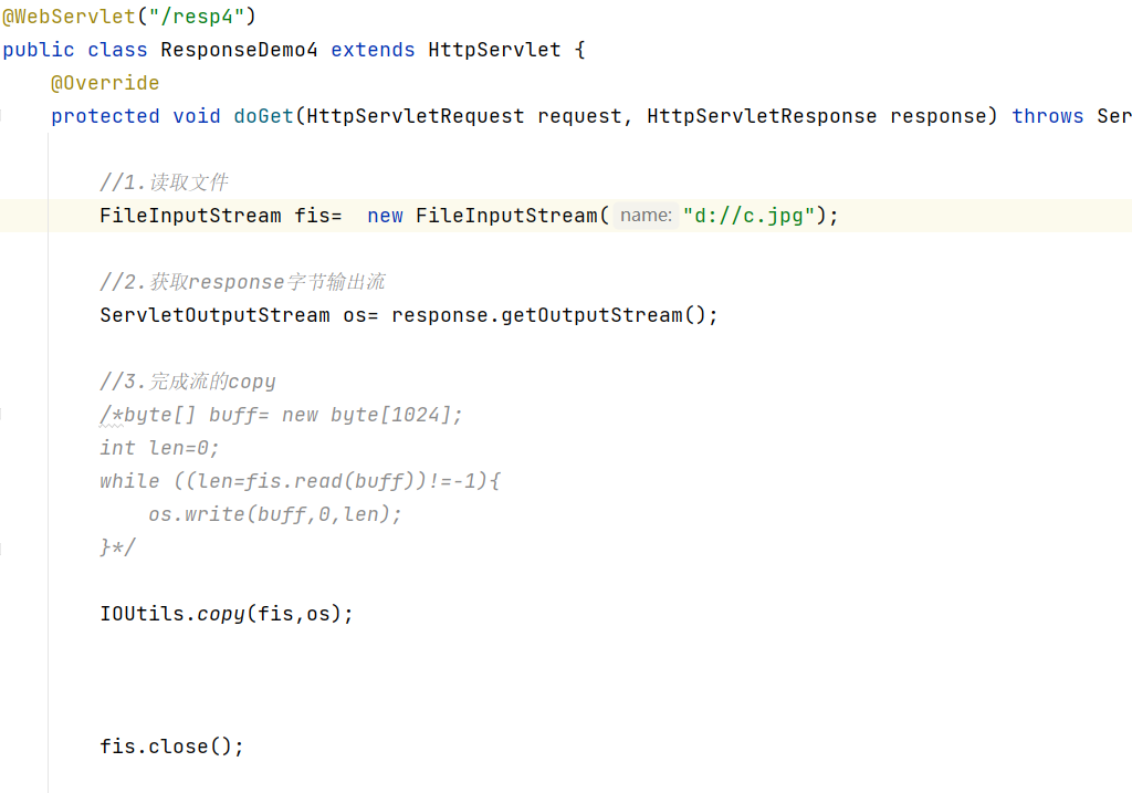 字节输出流:当输出,图片,视频等非文本信息时,需要用到直接输出流。字节输出流先要得到要输出的文件的字节输入流,再把这个文件输入流的字节数据复制给输出流,输出流再调用write方法输出: