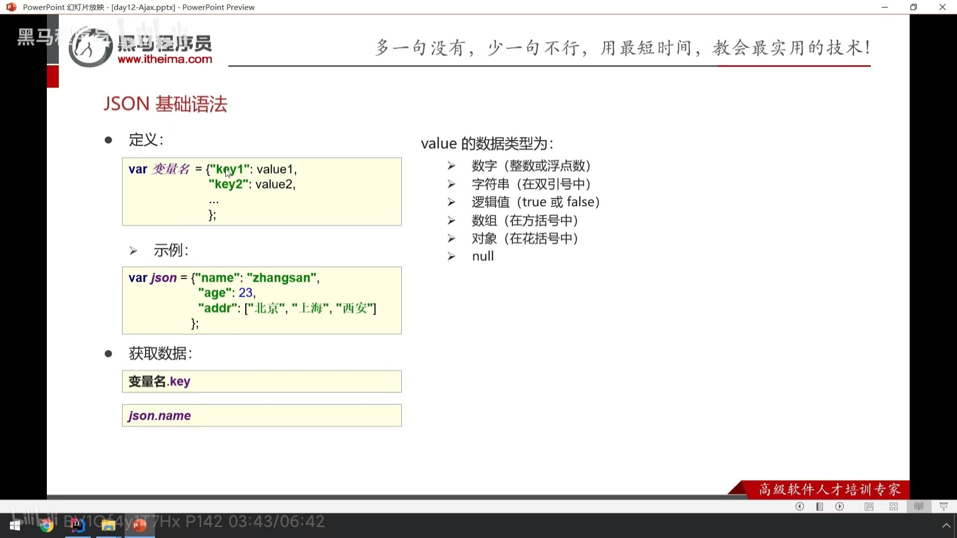然后就是json,json是当ajax与服务器进行请求和响应是,json可以封装数据,作为数据载体,在网络中进行数据传输。