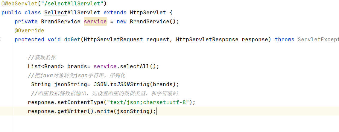实际当中是把,这个json写在web包的资源中和(ajax中),当有请求时,就会触发,然后再需要响应的数据,通过response 的write()方法输出出去(这只是对web资源中的描述),输出的是时候需要设置输出数据类型,是html还是其他的,还要设置字符编码集。