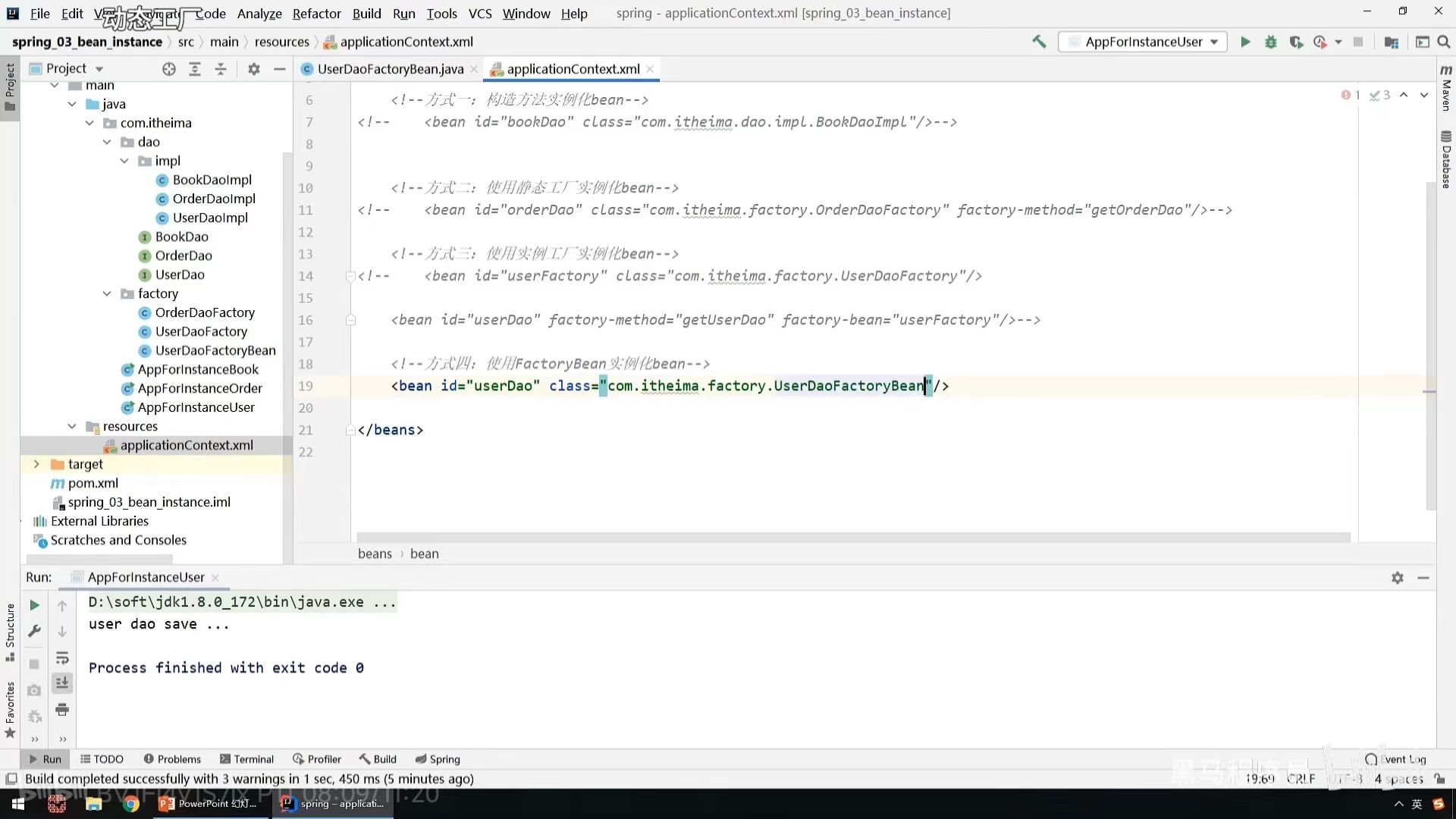 主要是因为,第三种实例化工厂模式的过于麻烦,所以才有了使用FactoryBean实例化Bean这种方法,使用这种方式前,需要先定义这个UserDaoFactoryBean类去实现一个接口就只是FactoryBean<UserdDao>,在这个接口中,可以定义泛型也就是UserDao。然后,需要实现接口中的方法,有两个是必须要实现,一个是选择实现。