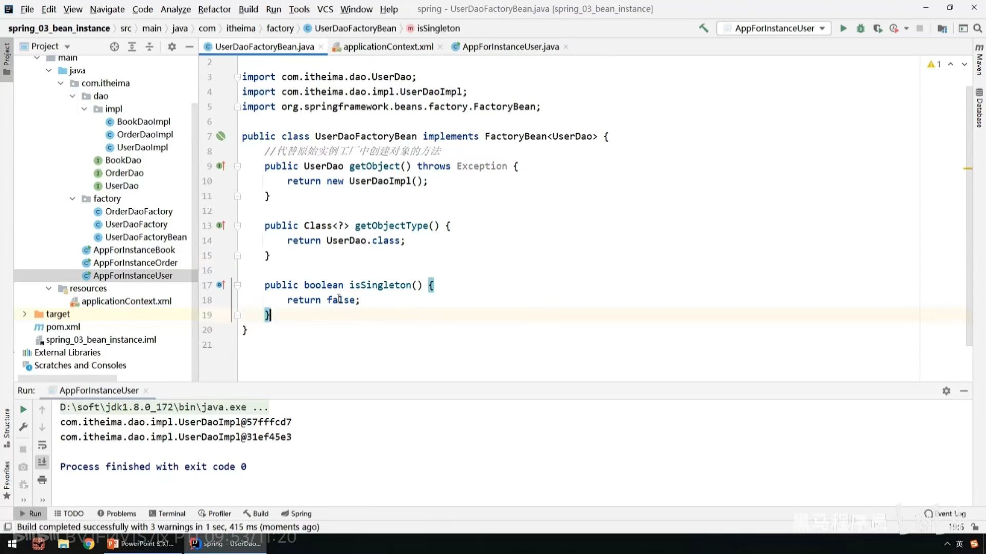 getObject这个方法,是确定得到的Bean,然后getObjectType(),是设置Bean的类型,return 这个UserDao.class,返回他的字节码文件。这个isSingleton就是设置是否是单例模式,默认是true,如果设置false,就不是单例模式了。然后再xml中,不要设置在设置那些factory-method ,factory-bean啥的。直接设置id=“” ,class=“‘,可以返回需要得到的bean。