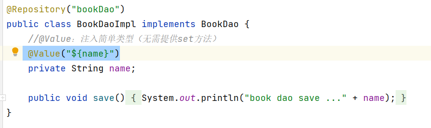 然后注解开发加载配置文件,就是用@PropertySource注解,在括号内指明配置文件的路径,在其他类中使用@Value("${名称}"),就可以读取配置文件中对应名称的值。