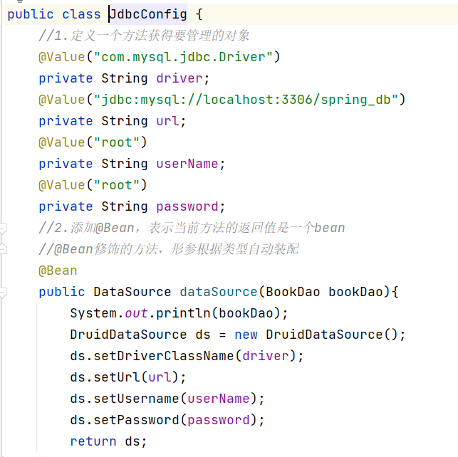 然后纯注解开发管理第三方的bean,就是必要导入的某个jar包而要获里面的 对象,也就是bean的时候,需要先写一个类,比如说jdbcconfig类,在这个类里面new对象,配置其他的属性,