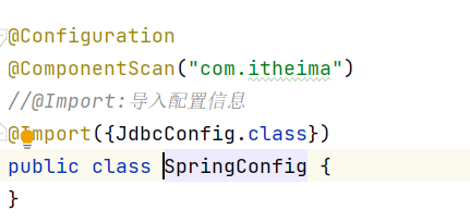 首先需要在这个类的上面写上@Configuration注解,表名这个可以等下被SpringConfig扫描(当然也可以不选择这种方法,则需在SpringConfig类上写上@import(“地址”)),