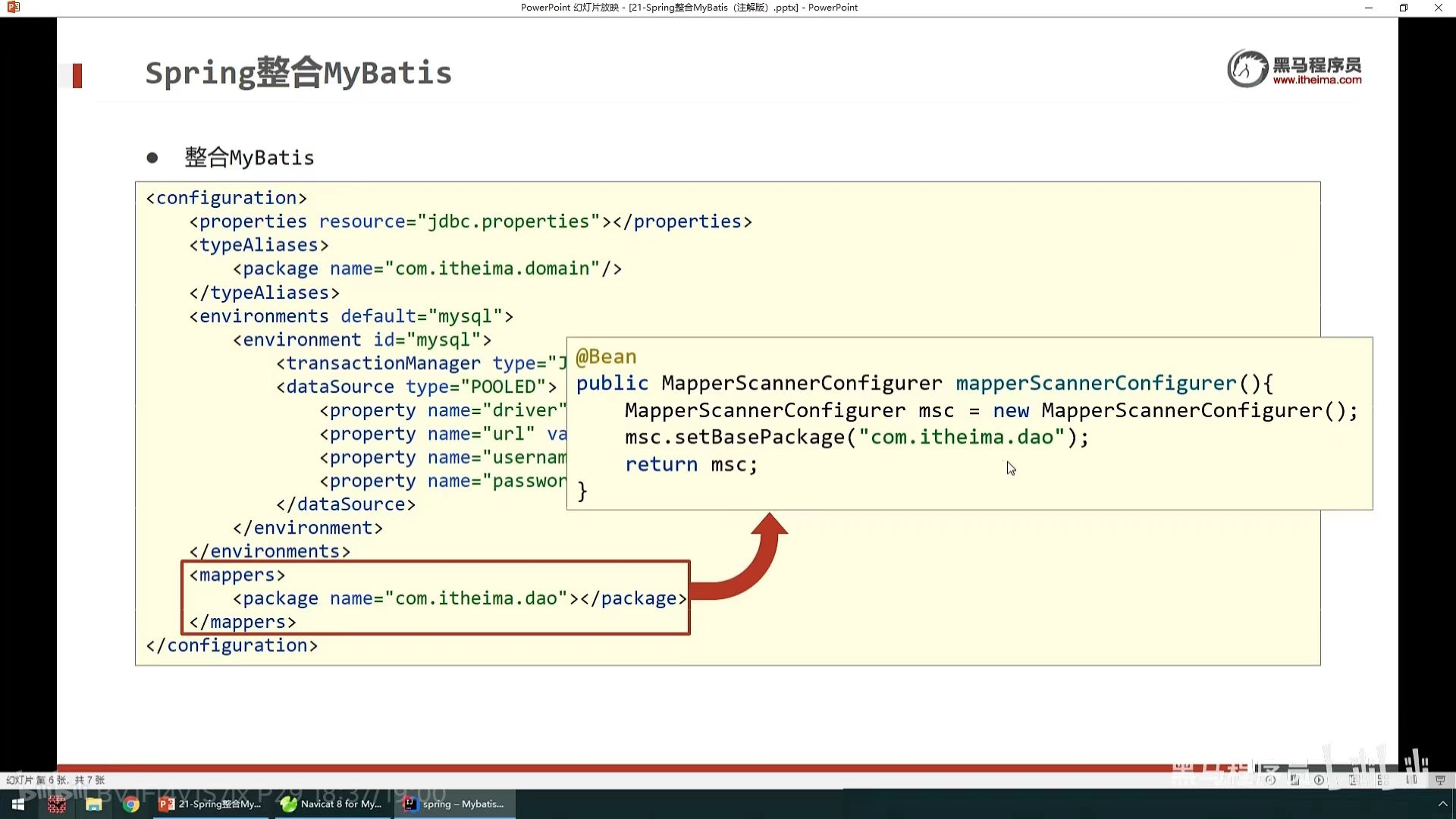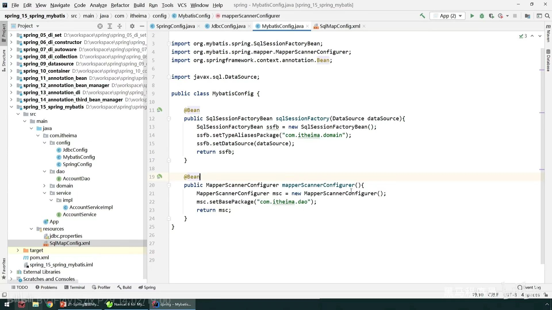 然后这个java类中有两个需要创建的bean一个是SQLSessionFactory(连接工厂类)另一个是Mapper(代理开发),这个两个bean都需要用到那个引入的jar包(也就是Spring整mybatis的jar包中)中的类来创建的的对象,创建SQLSessionFactory需要引入的是SqlSessionFactoryBean,创建Mapper需要引入的是MapperScannerConfigurer(这个mapper主要是说明,在哪里需要用到这个mybatis,也就是映射),然后各自的方法里new出对象后,给对象设置相应的属性值,如DataSource(这里这个DataSource是里面封装好了这些url,root,password等属性)