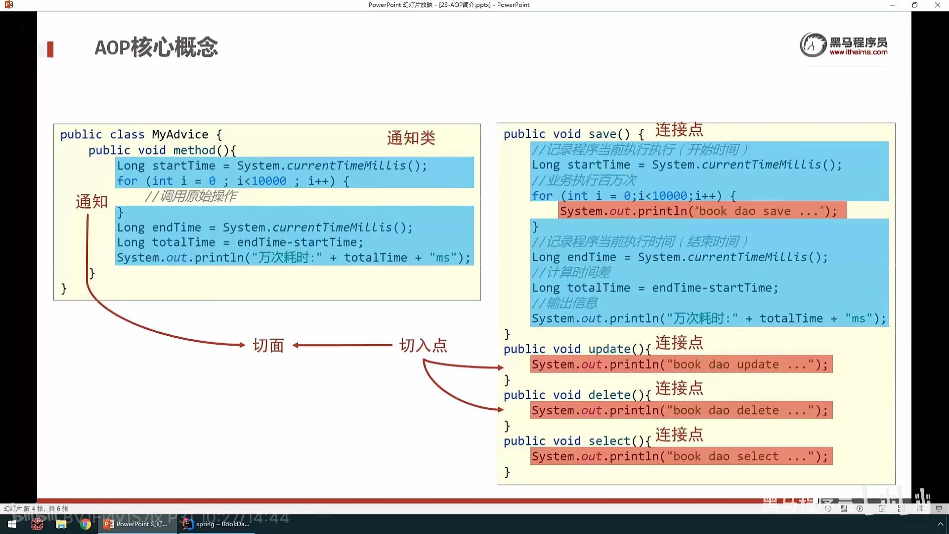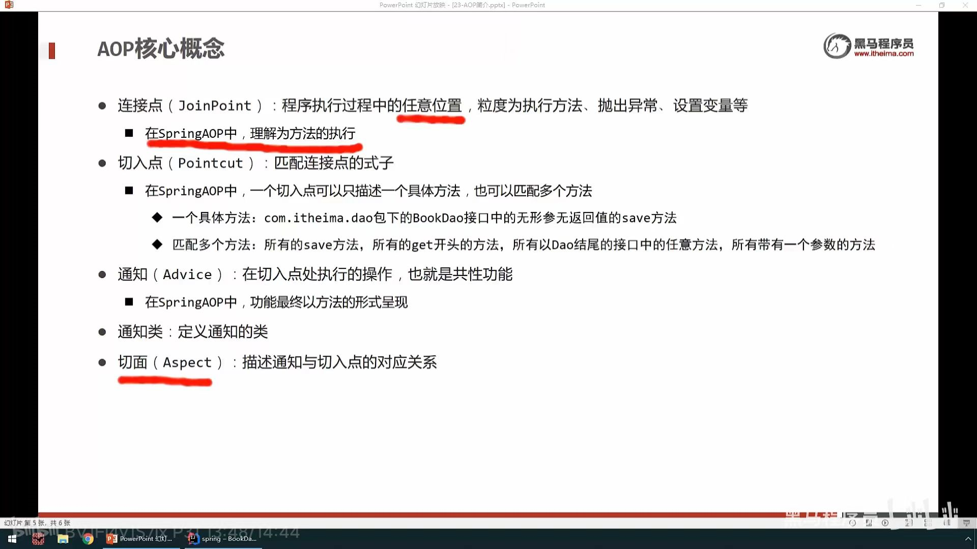 连接点就是原始类中所有的方法,切入点是原始类中需要做增强的方法,也就是需要和Spring绑定的方法,通知就是需要做的增强的功能,也就是切入点执行的操作,切面就是描述同志爱和切入点之间的关系(是after还是before还是around)