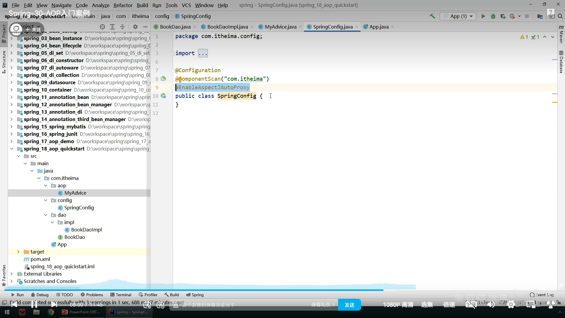 ,然后在SpringConfig上面写上一个@EnableAspect,,注解,告诉这个SpringConfig类要加载这个aop的通知类