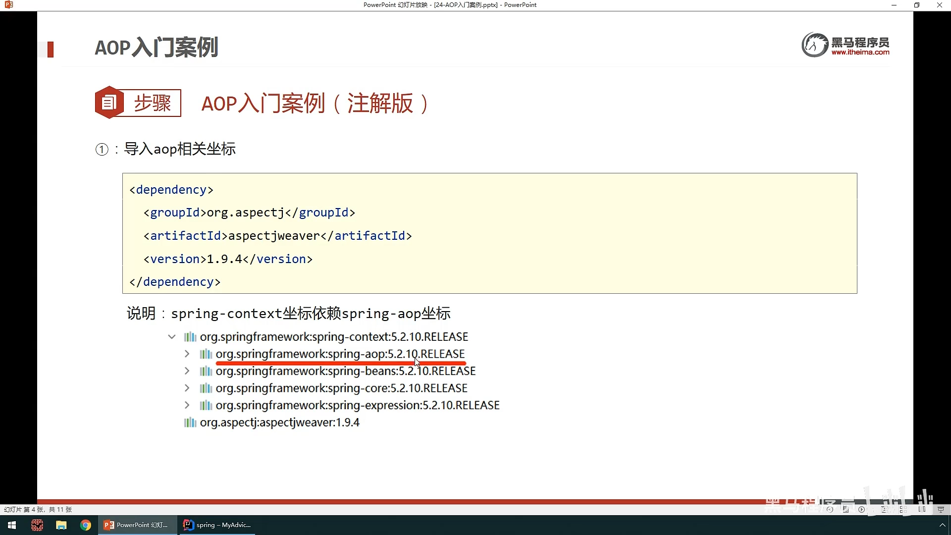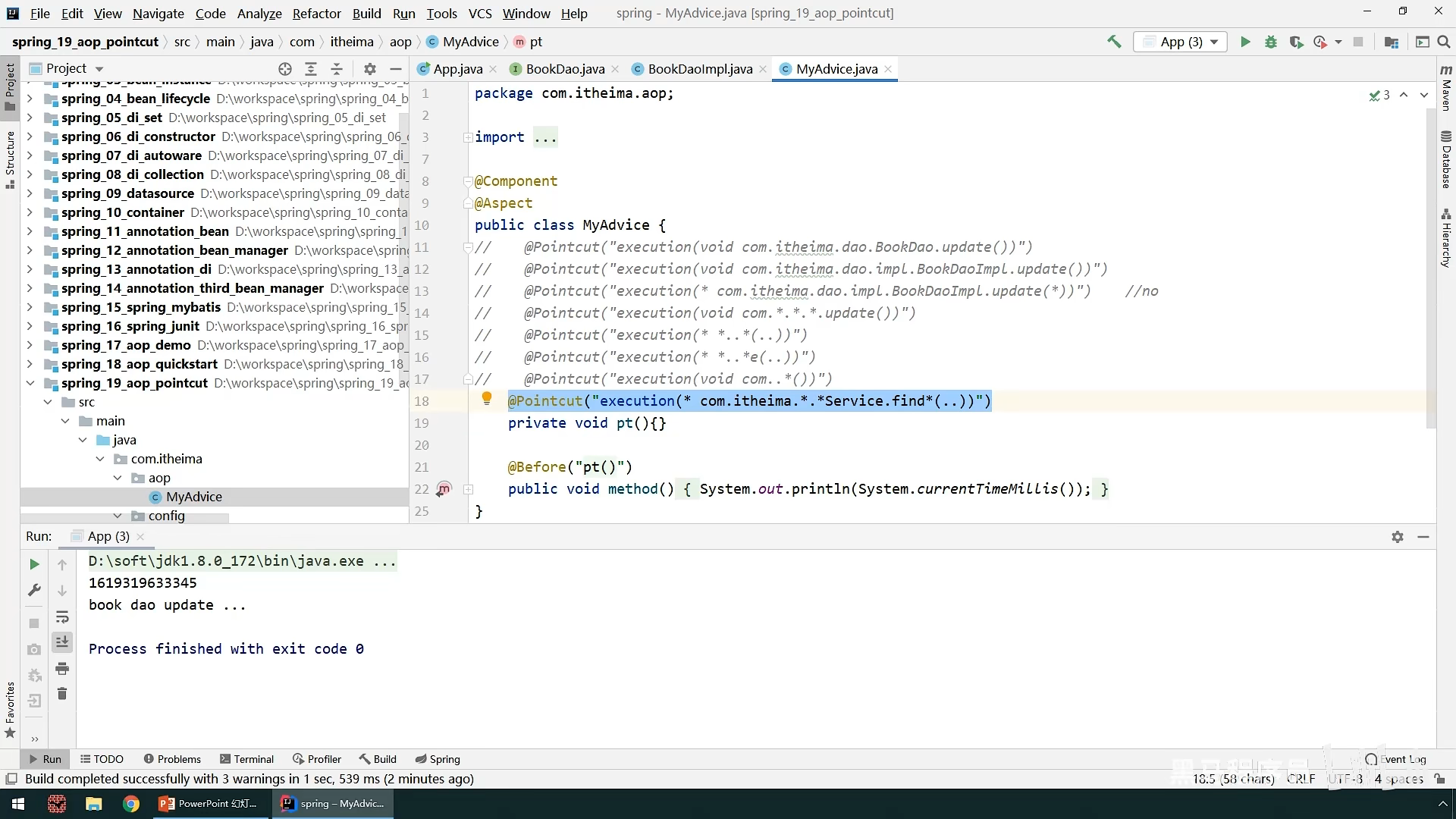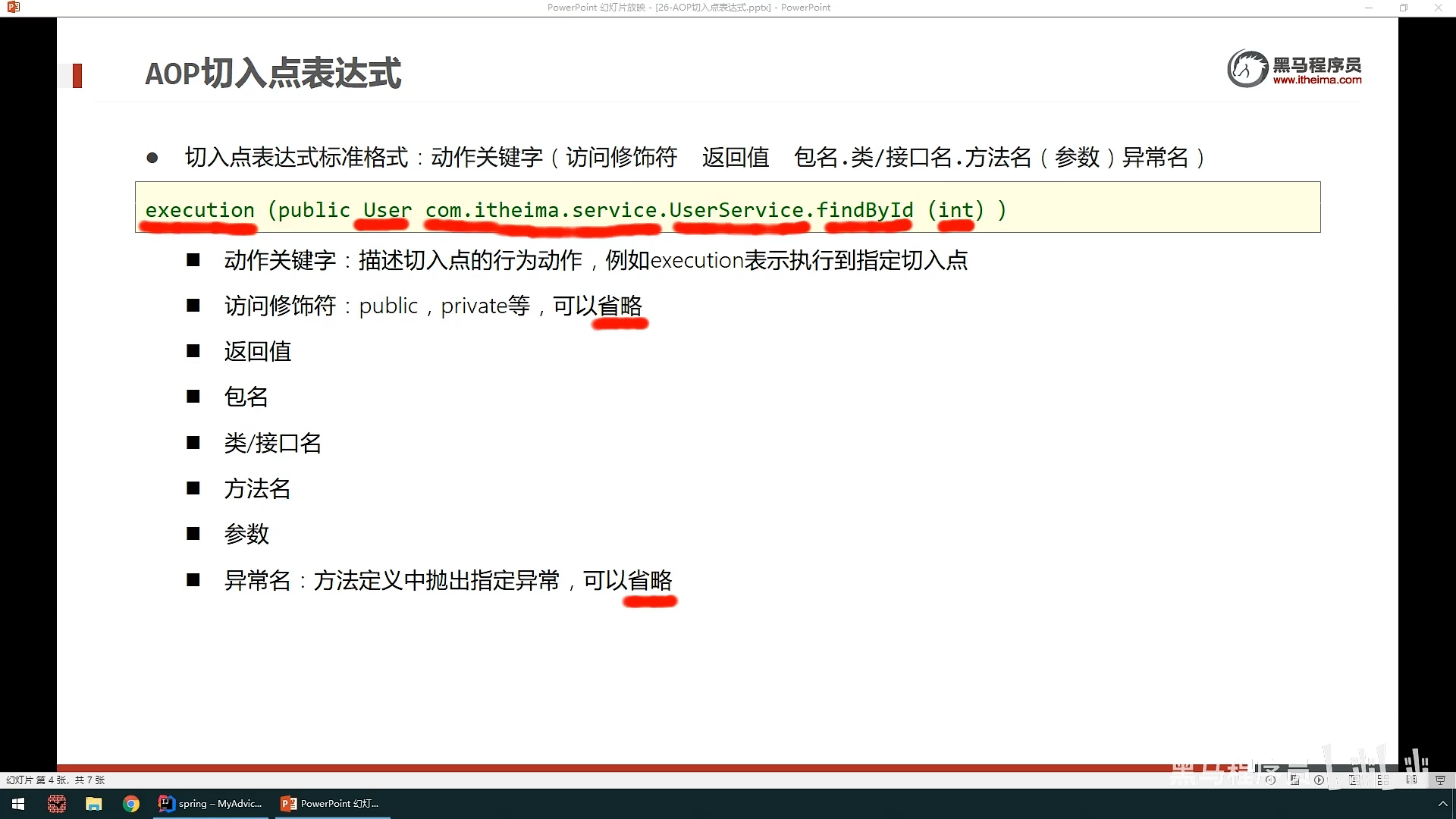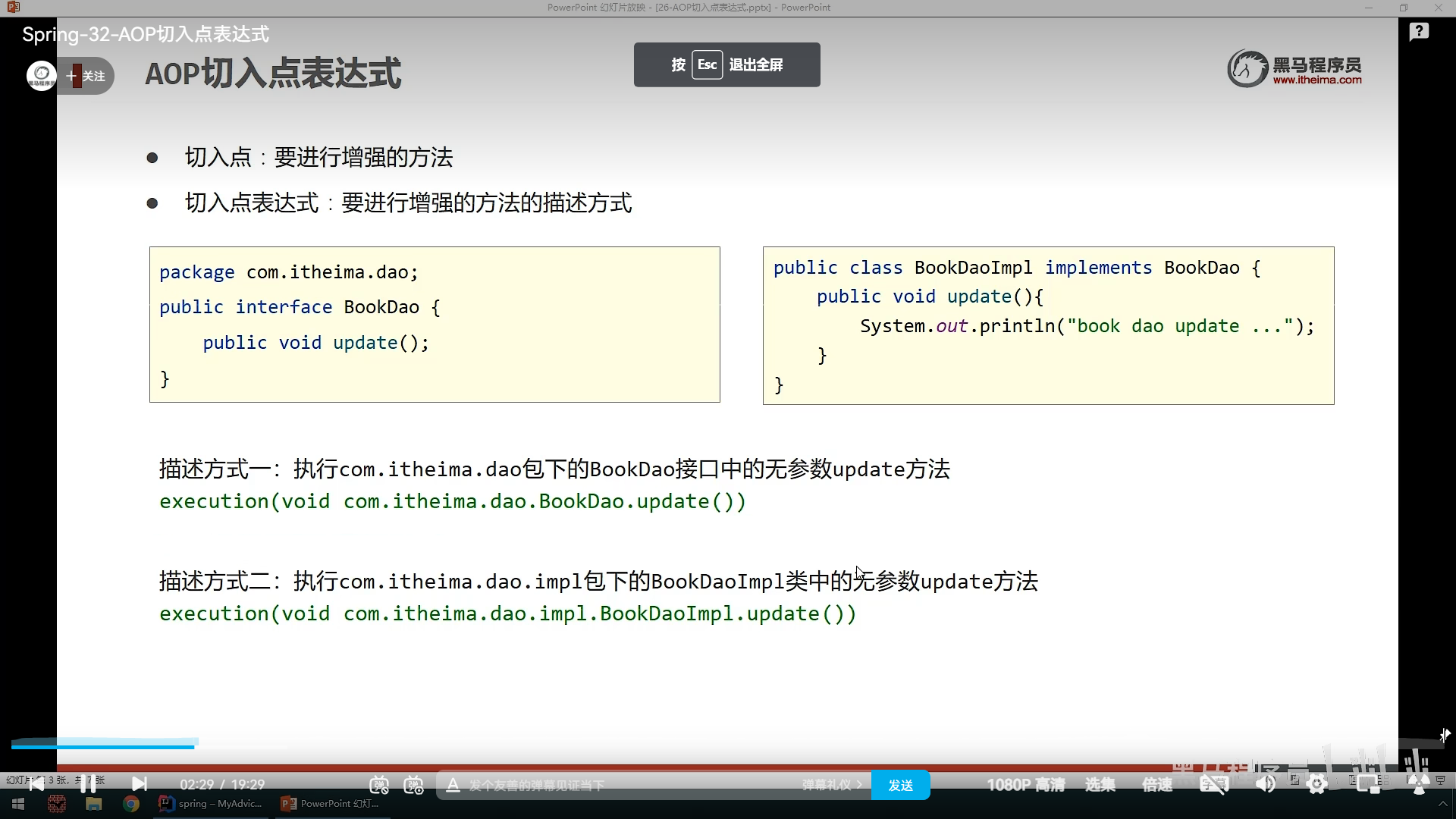 关键在于上面的注解,注解后面有一行内容,就是切入点表达式,用来描述切入点的,就是那个包下的那个类中的那个方法要作为切入点,描述方式有两种一种是写接口中的,另一种是写实现类中的,但是为了减低代码的耦合性所以,就选用第一种方法