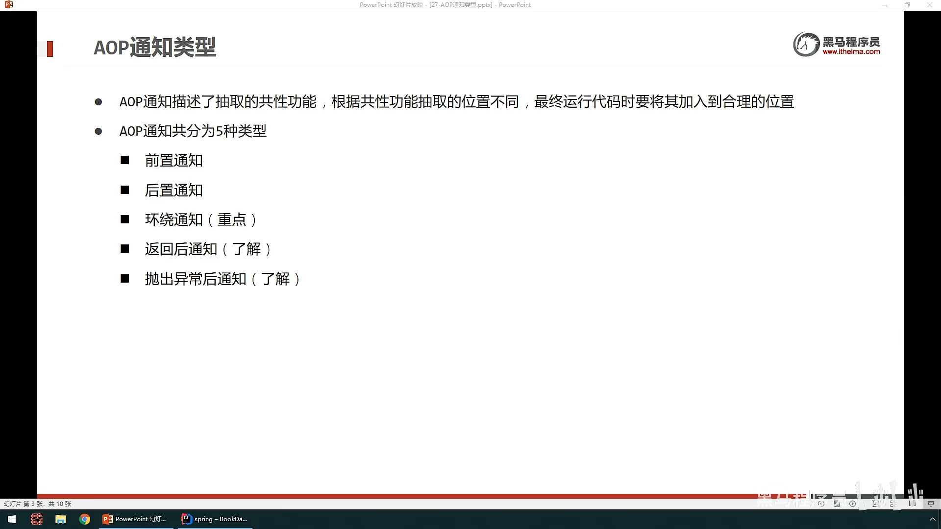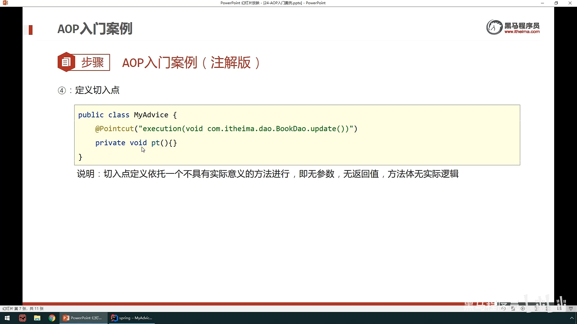写完切入点之后需要写一个方法,方法里面就写通知,也就是需要增强的功能,然后再通知上需写上一个注解,注解里面写上那个切点的方法,这个注解就表名这个切入点与属性的关系,是前置还是后置,还是环绕,相当于把切入点与通知绑定起来,也就是搞成了切面。