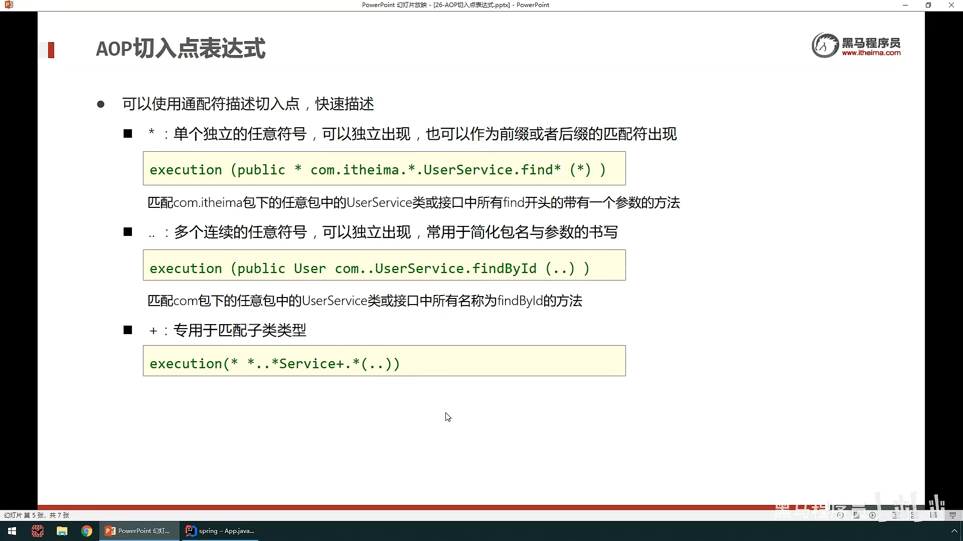 比如说这个切入点表达式就代表,任意返回类型,com.itheima下任意包下以Service结尾的任意类下的,以find开头的任意方法,参数任意