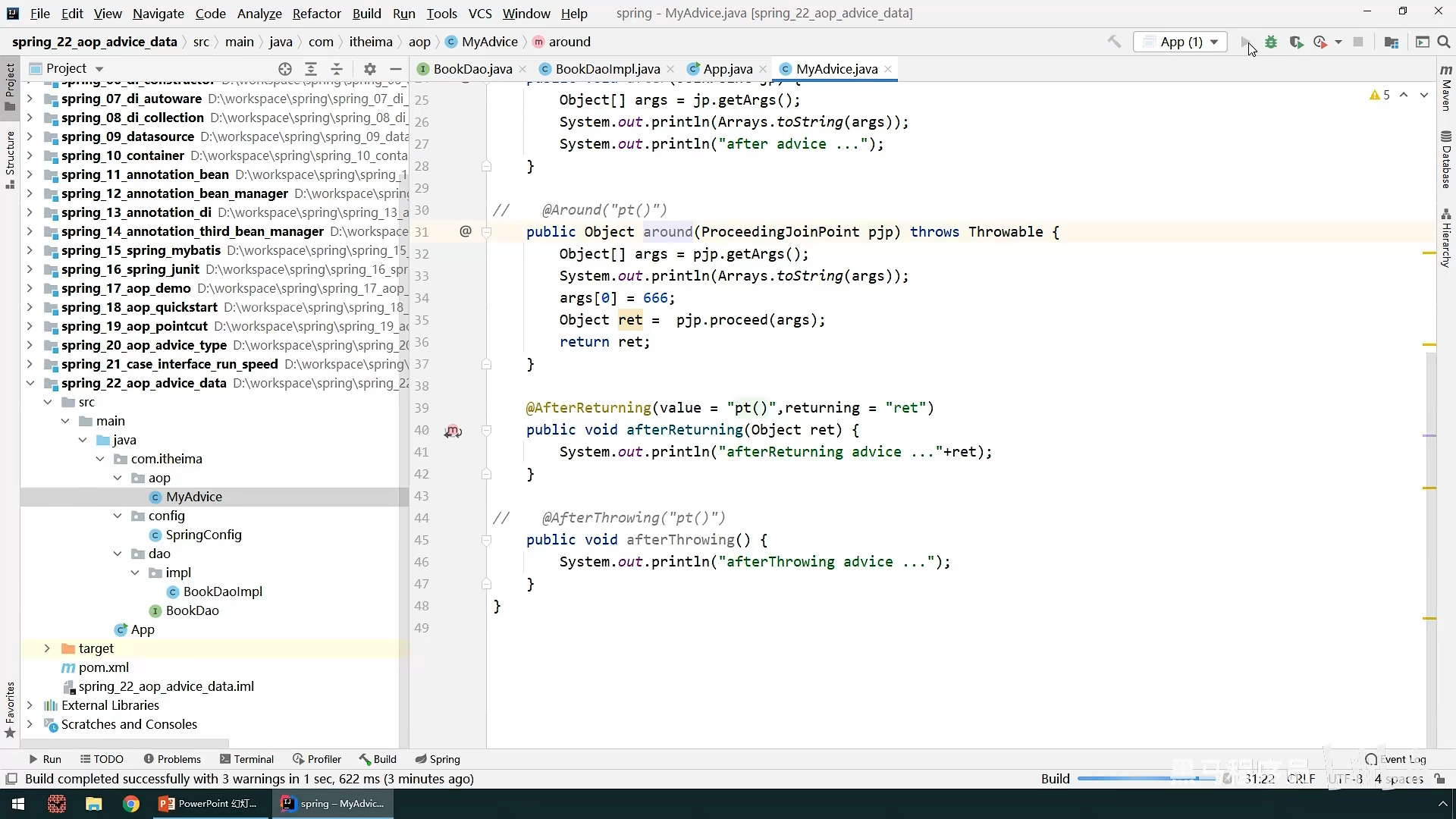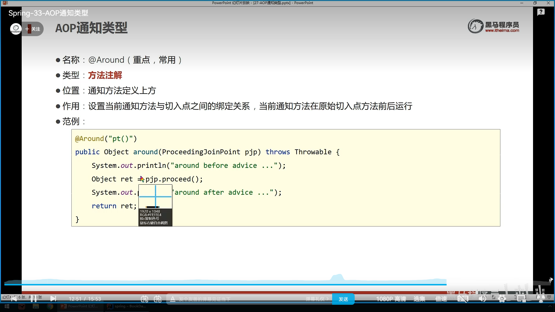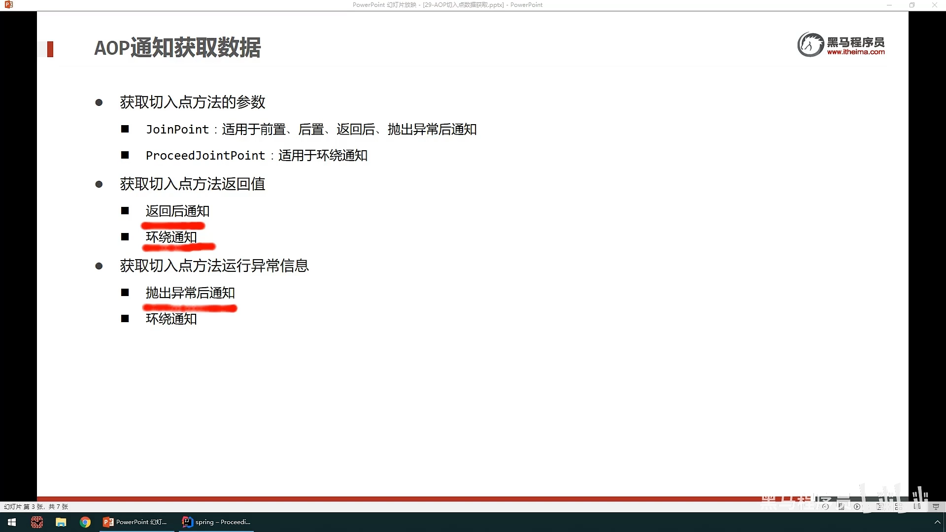重点需要知道环绕通知,环绕通知里面,需要一个ProceedingJoinPoint 创建的对象来调用这个proceed()这个方法,因为如果不调用这个方法,那么原始类中的方法不会执行,而只会执行这个通知中的方法,也就是增强的功能。有的原始方法,他是有返回值类型的,所以我定义方法的返回类型为Object,然后再return这个结果“ret”
