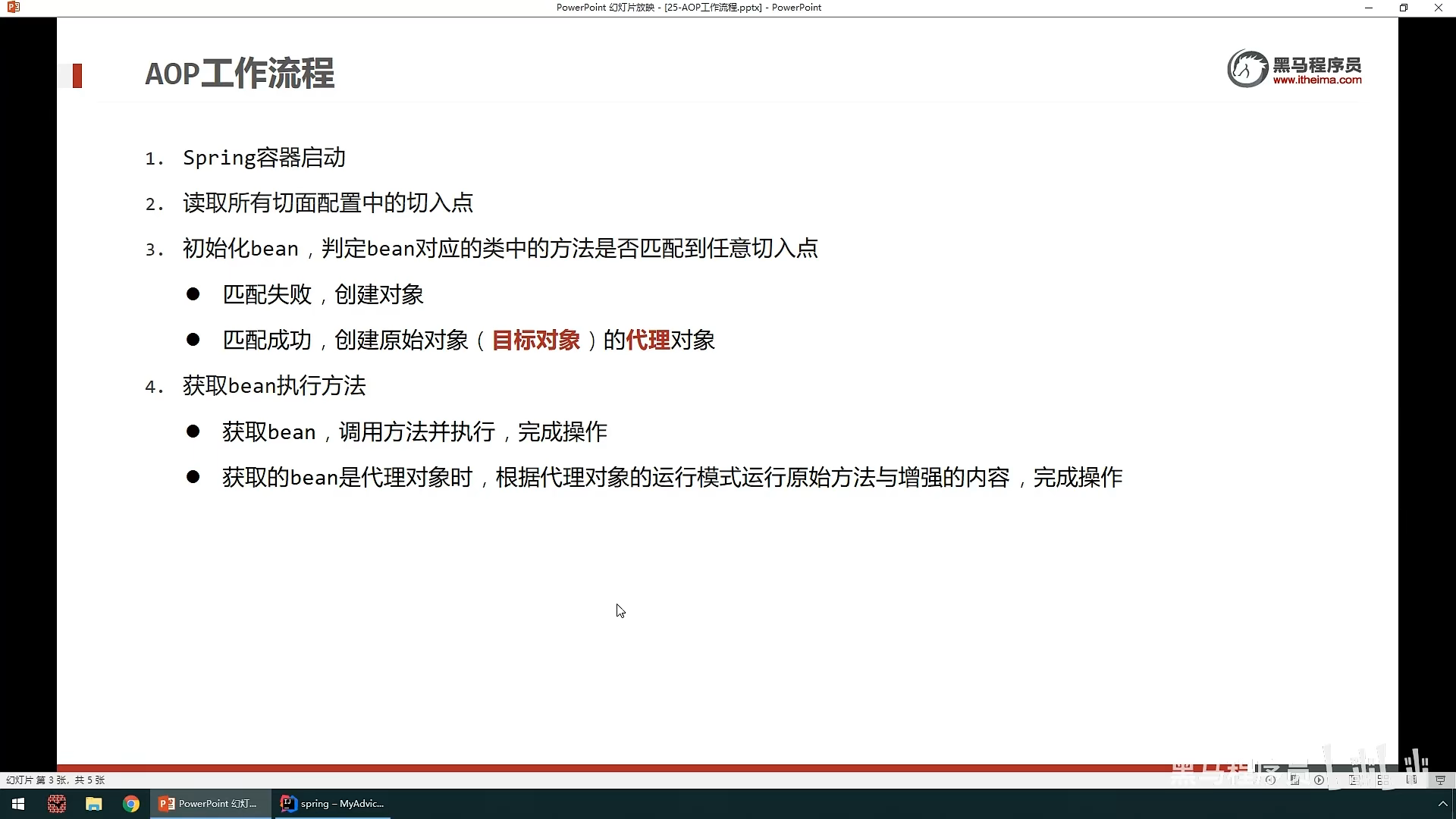 再说一下这个aop得工作流程吧,Spring容器启动后,先读取所有切面配置中的切入点,然后初始化bean,判定bean对应的类中方法是匹配到任意切入点,也就是比对是否有这个切入点一样的方法,如果有那就创建原始对象的代理对象,执行原始方法和增强方法,如果没有也就是匹配失败,那就创建原始对象,执行原始方法。