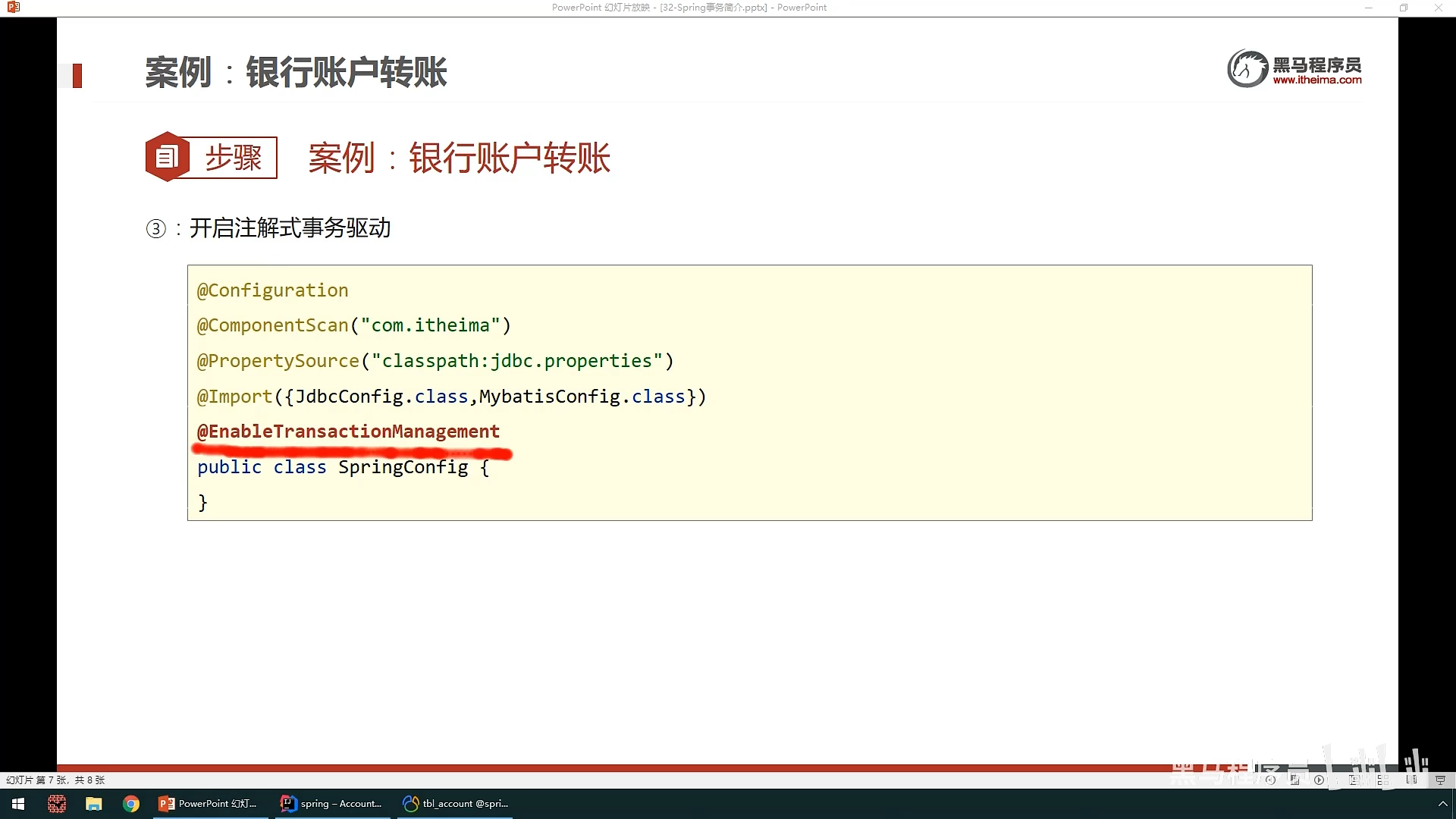 然后就在SpringConfig类上面添加@EnableTranesacction..标签