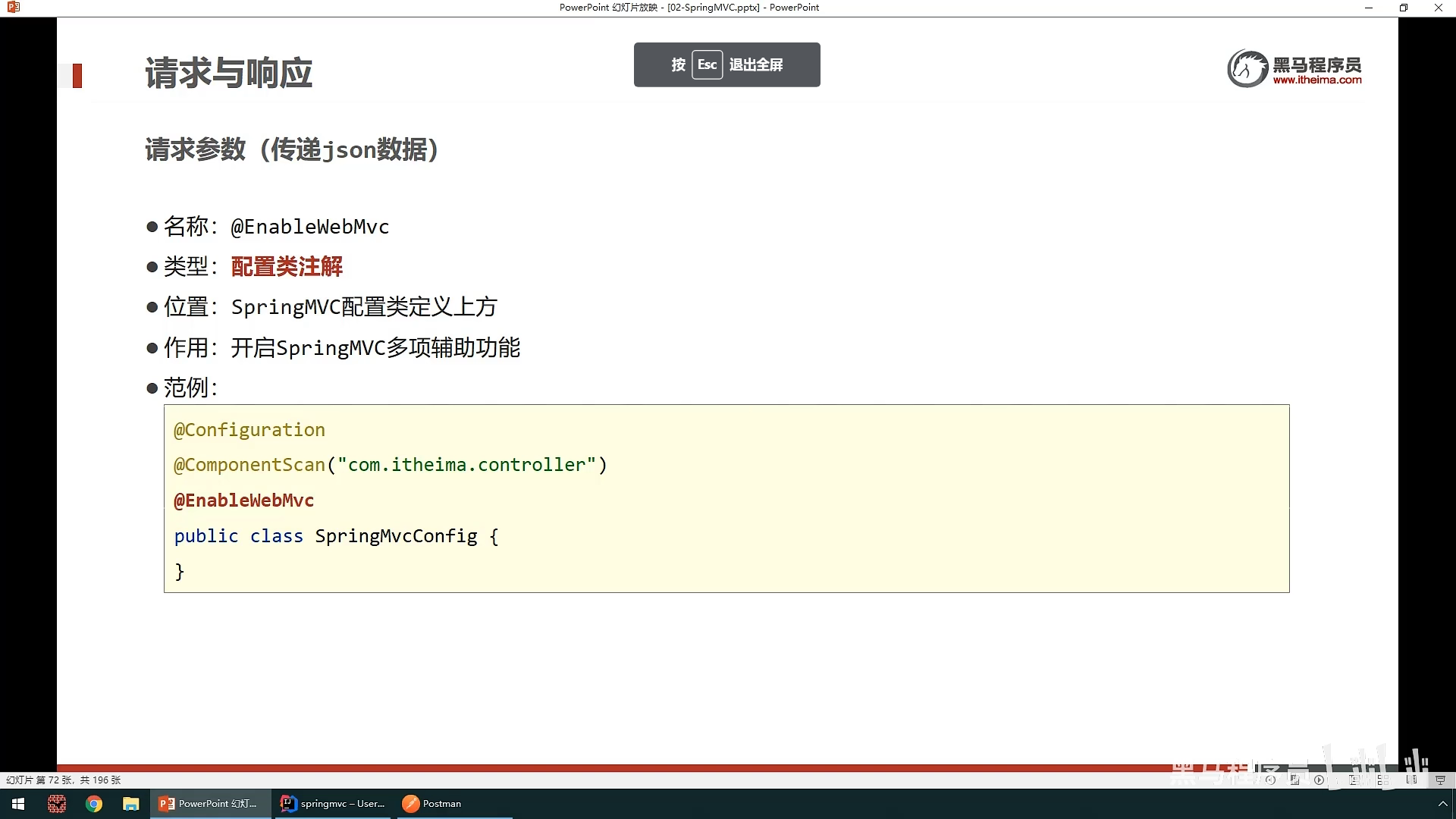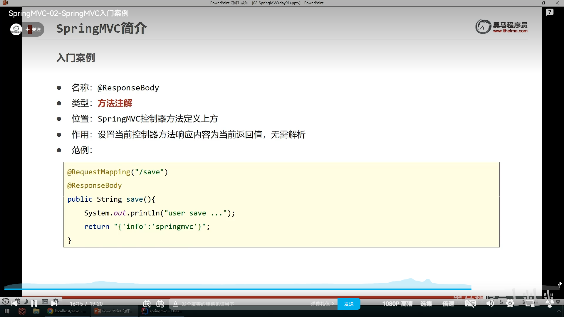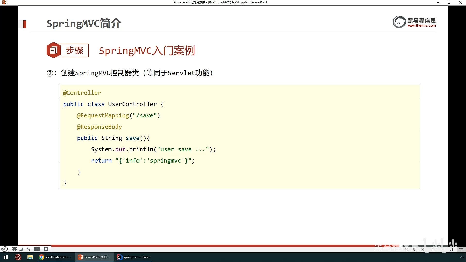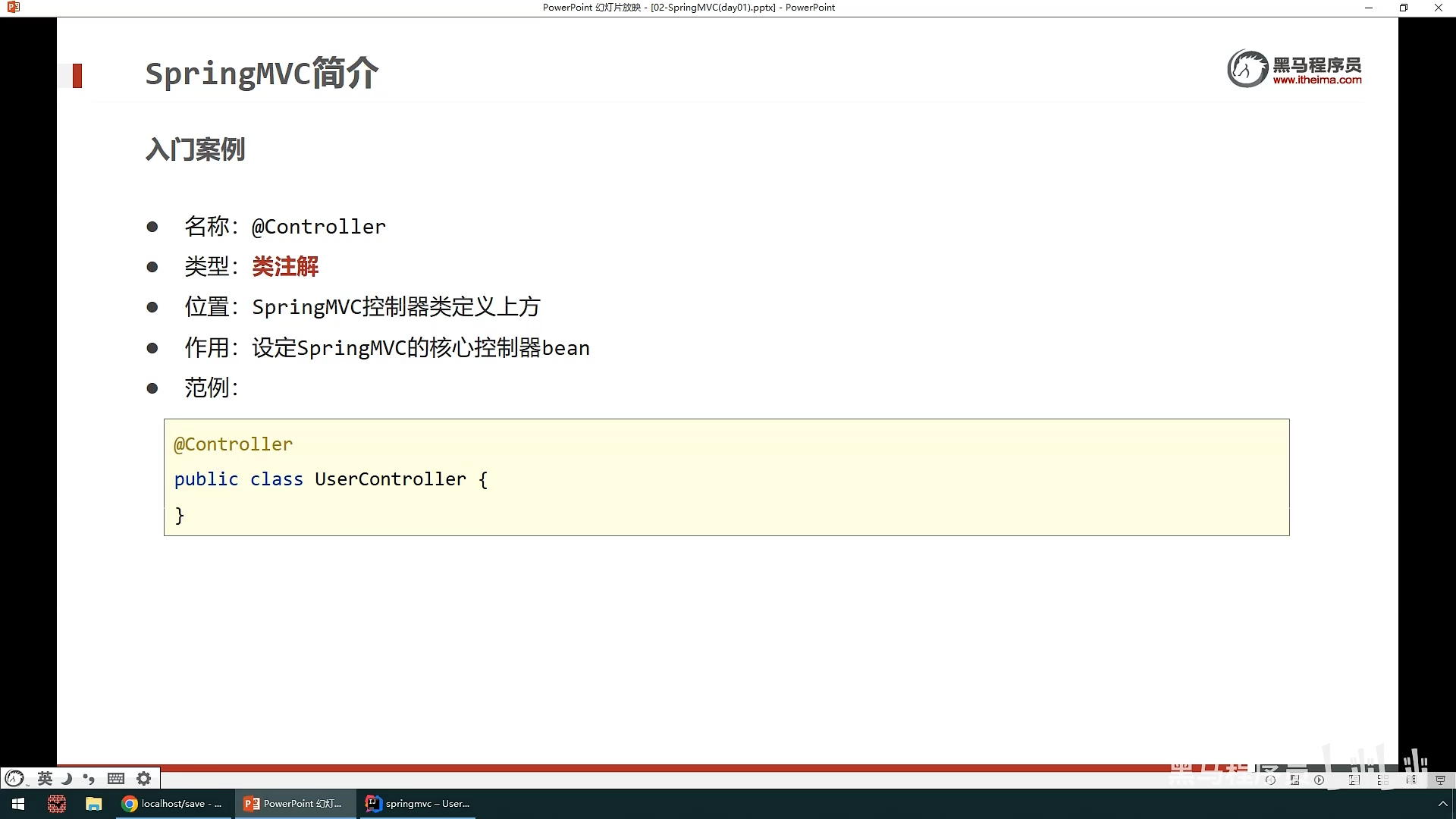 ,然后创建一个SpringMvc控制器类,这个相当于servlet功能,就是在里面设置访问的资源,然后资源的路径,响应的数据。所以需要在类上面使用@Controller注解来标明这是SpringMvc核心控制器类,然后再用@ResponseBody来标记返回值类型,@requestmapping注解来设置访问路径